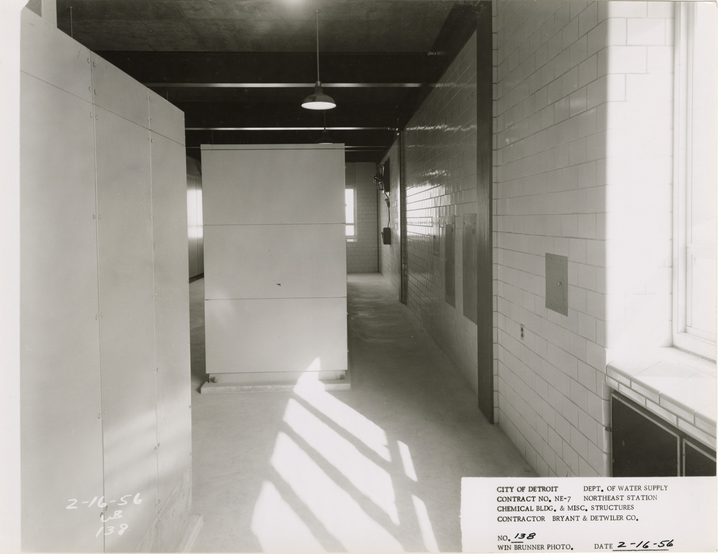 View of motor control center, Chemical Building during construction, Northeast Station, Detroit water supply system. Printed on front: "City of Detroit. Department of Water Supply. Contract no. NE-7. Northeast Station. Chemical Bldg. & misc. structures. Contractor Bryant & Detwiler Co. No. 138. Win Brunner photo. Date: 2-16-56." Typed on back: "No. 138. Back of motor control center 13P at the left and end of unit substation no. 2 in the center, second floor of Chemical Bldg."