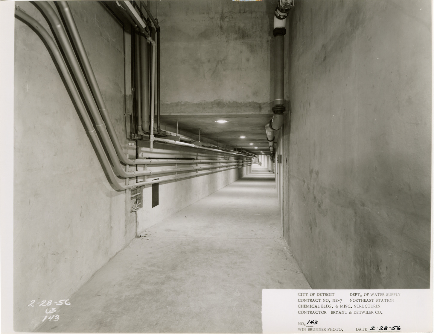 View of entrance to pedestrian tunnel, Chemical Building during construction, Northeast Station, Detroit water supply system. Printed on front: "City of Detroit. Department of Water Supply. Contract no. NE-7. Northeast Station. Chemical Bldg. & misc. structures. Contractor Bryant & Detwiler Co. No. 143. Win Brunner photo. Date: 2-28-56." Typed on back: "No. 143. Entrance to pedestrian tunnel from Chemical Building."