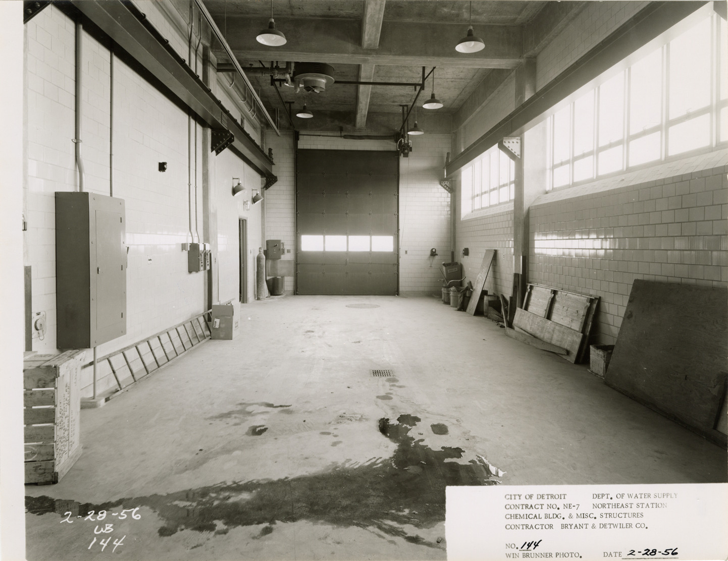 View of workshop, Chemical Building during construction, Northeast Station, Detroit water supply system. Printed on front: "City of Detroit. Department of Water Supply. Contract no. NE-7. Northeast Station. Chemical Bldg. & misc. structures. Contractor Bryant & Detwiler Co. No. 144. Win Brunner photo. Date: 2-28-56." Typed on back: "No. 144. Work shop in Chemical Building looking west."