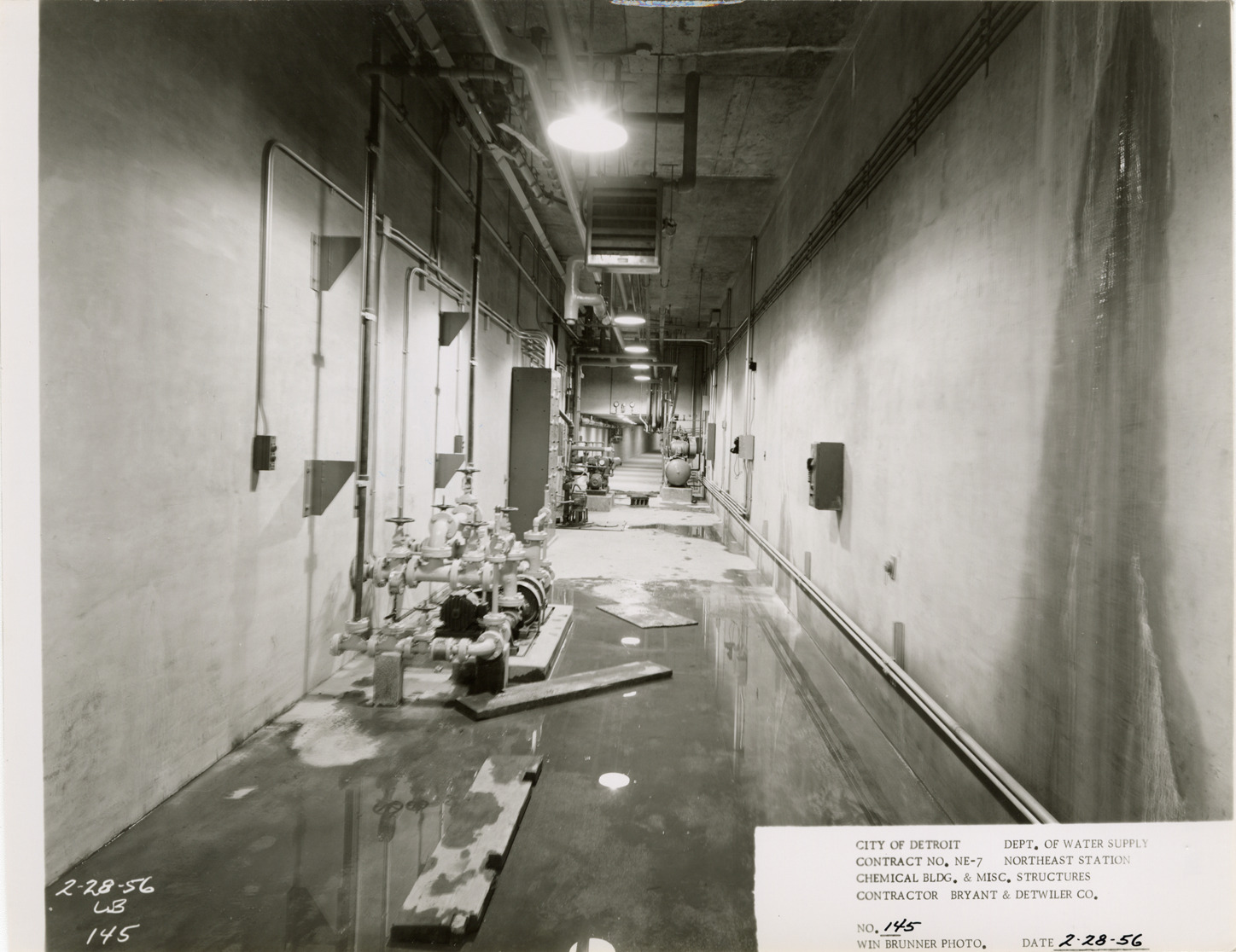 View of basement passageway, Chemical Building during construction, Northeast Station, Detroit water supply system. Printed on front: "City of Detroit. Department of Water Supply. Contract no. NE-7. Northeast Station. Chemical Bldg. & misc. structures. Contractor Bryant & Detwiler Co. No. 145. Win Brunner photo. Date: 2-28-56." Typed on back: "No. 145. Basement passageway looking north."