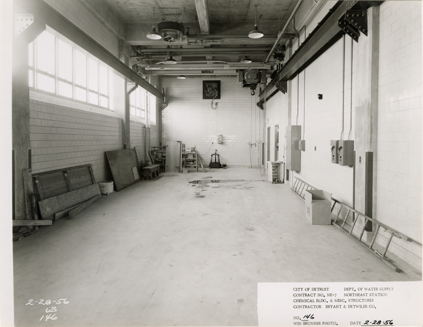 View of workshop, Chemical Building during construction, Northeast Station, Detroit water supply system. Printed on front: "City of Detroit. Department of Water Supply. Contract no. NE-7. Northeast Station. Chemical Bldg. & misc. structures. Contractor Bryant & Detwiler Co. No. 146. Win Brunner photo. Date: 2-28-56." Typed on back: "No. 146. Work shop in Chemical Building looking east."