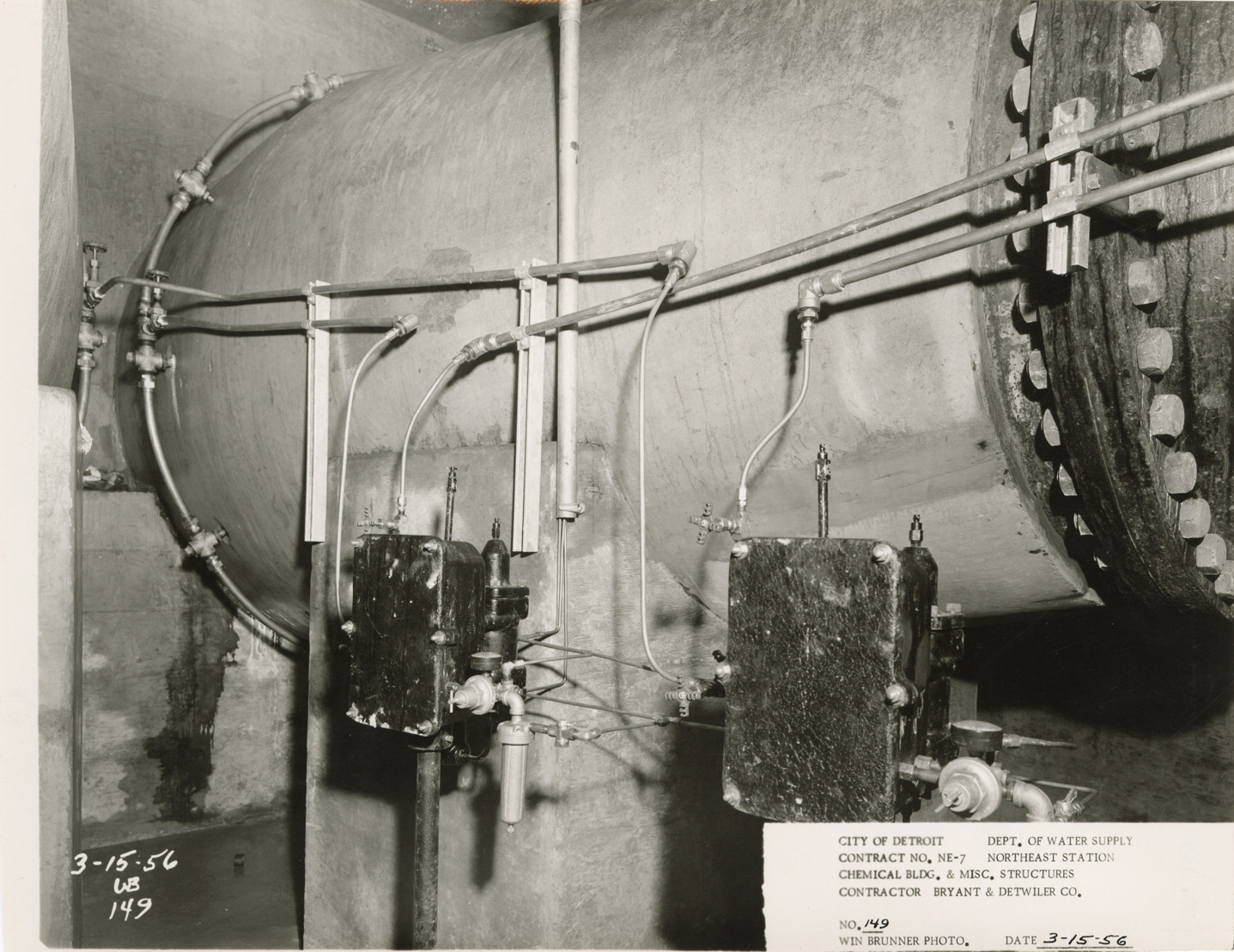 View of Venturi meter transmitters for raw water conduit, Chemical Building during construction, Northeast Station, Detroit water supply system. Printed on front: "City of Detroit. Department of Water Supply. Contract no. NE-7. Northeast Station. Chemical Bldg. & misc. structures. Contractor Bryant & Detwiler Co. No. 149. Win Brunner photo. Date: 3-15-56." Typed on back: "No. 149. East raw water conduit showing Venturi meter transmitters."