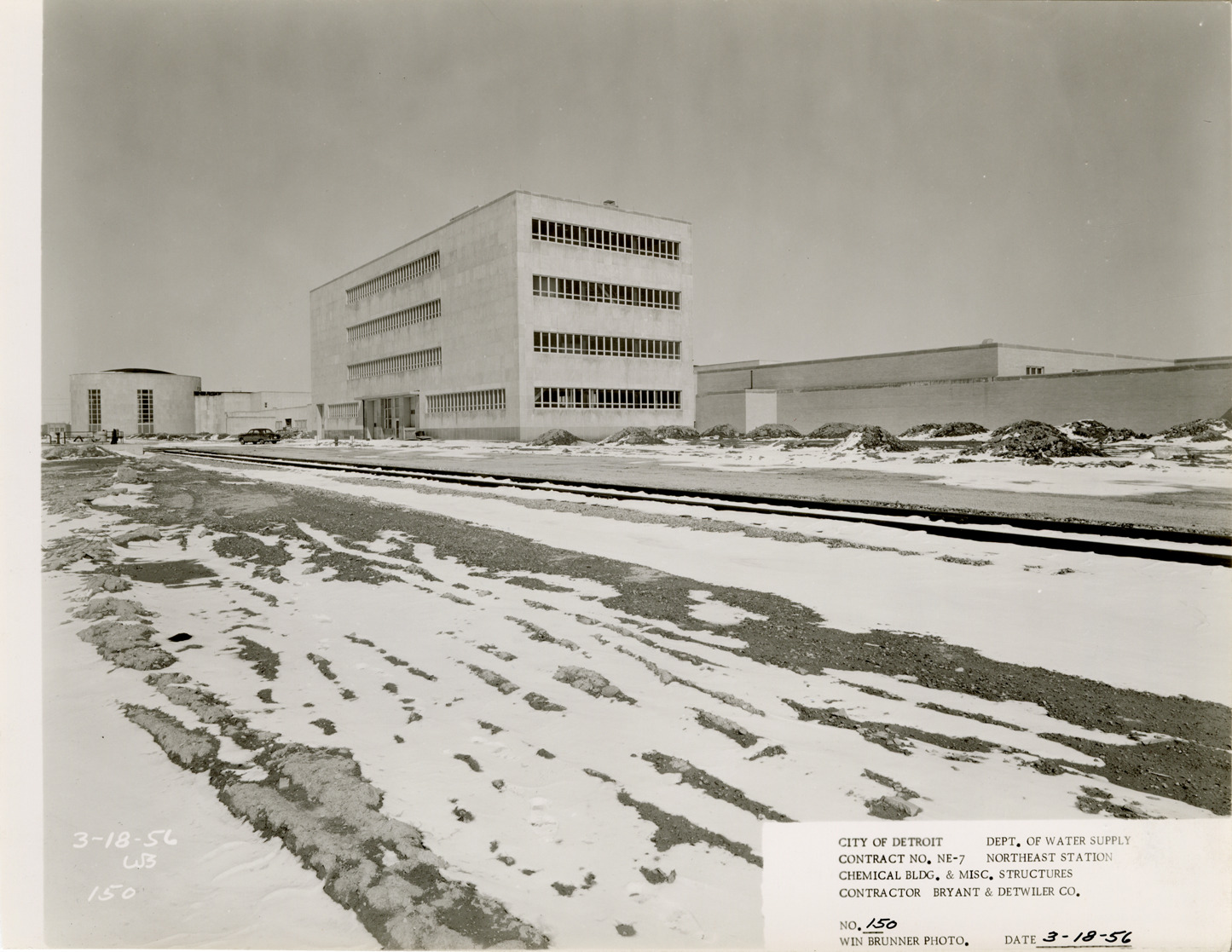 View of Chemical Building during construction, Northeast Station, Detroit water supply system. Printed on front: "City of Detroit. Department of Water Supply. Contract no. NE-7. Northeast Station. Chemical Bldg. & misc. structures. Contractor Bryant & Detwiler Co. No. 150. Win Brunner photo. Date: 3-18-56." Typed on back: "No. 150. West & south elevations of Chemical Building. Low lift building at extreme left and settling basins at right."