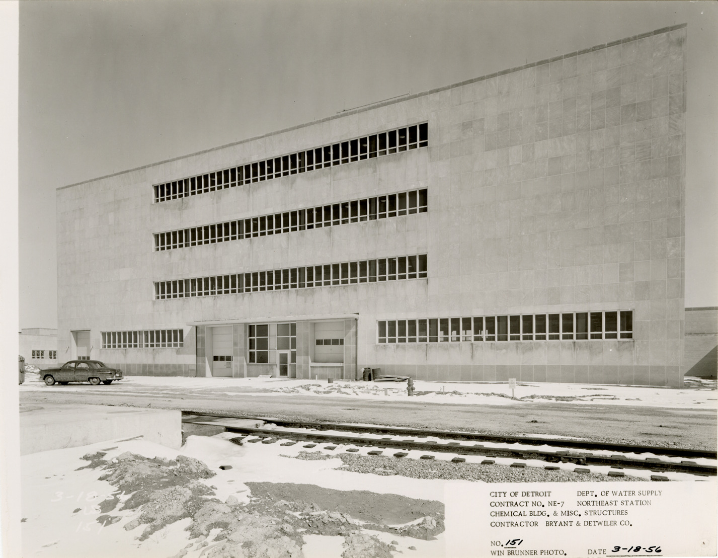 View of Chemical Building during construction, Northeast Station, Detroit water supply system. Printed on front: "City of Detroit. Department of Water Supply. Contract no. NE-7. Northeast Station. Chemical Bldg. & misc. structures. Contractor Bryant & Detwiler Co. No. 151. Win Brunner photo. Date: 3-18-56." Typed on back: "No. 151. West elevation of Chemical Building."