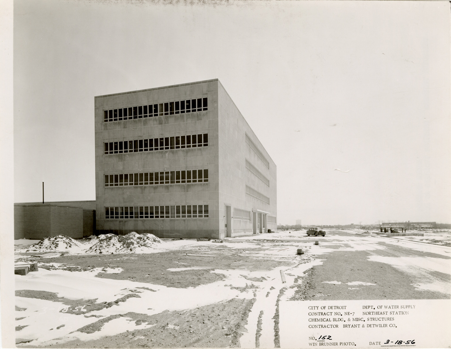 View of Chemical Building during construction, Northeast Station, Detroit water supply system. Printed on front: "City of Detroit. Department of Water Supply. Contract no. NE-7. Northeast Station. Chemical Bldg. & misc. structures. Contractor Bryant & Detwiler Co. No. 152. Win Brunner photo. Date: 3-18-56." Typed on back: "No. 152. West elevation of Chemical Building."