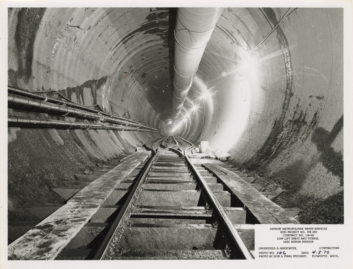 View of raw water intake tunnel, Lake Huron Station, Detroit water supply system. Printed on front: "Detroit Metropolitan Water Services. HUD Project no. WS 289. Contract no. LH-6B. Low lift shaft and tunnel. Lake Huron Station. Greenfield & Associates, contractors. Photo no: 106. Date: 4-8-70. Photo by Don & Pearl Stickney, Plymouth, Mich." Handwritten on back: "106. Raw water intake tunnel Sta. 180 looking west."