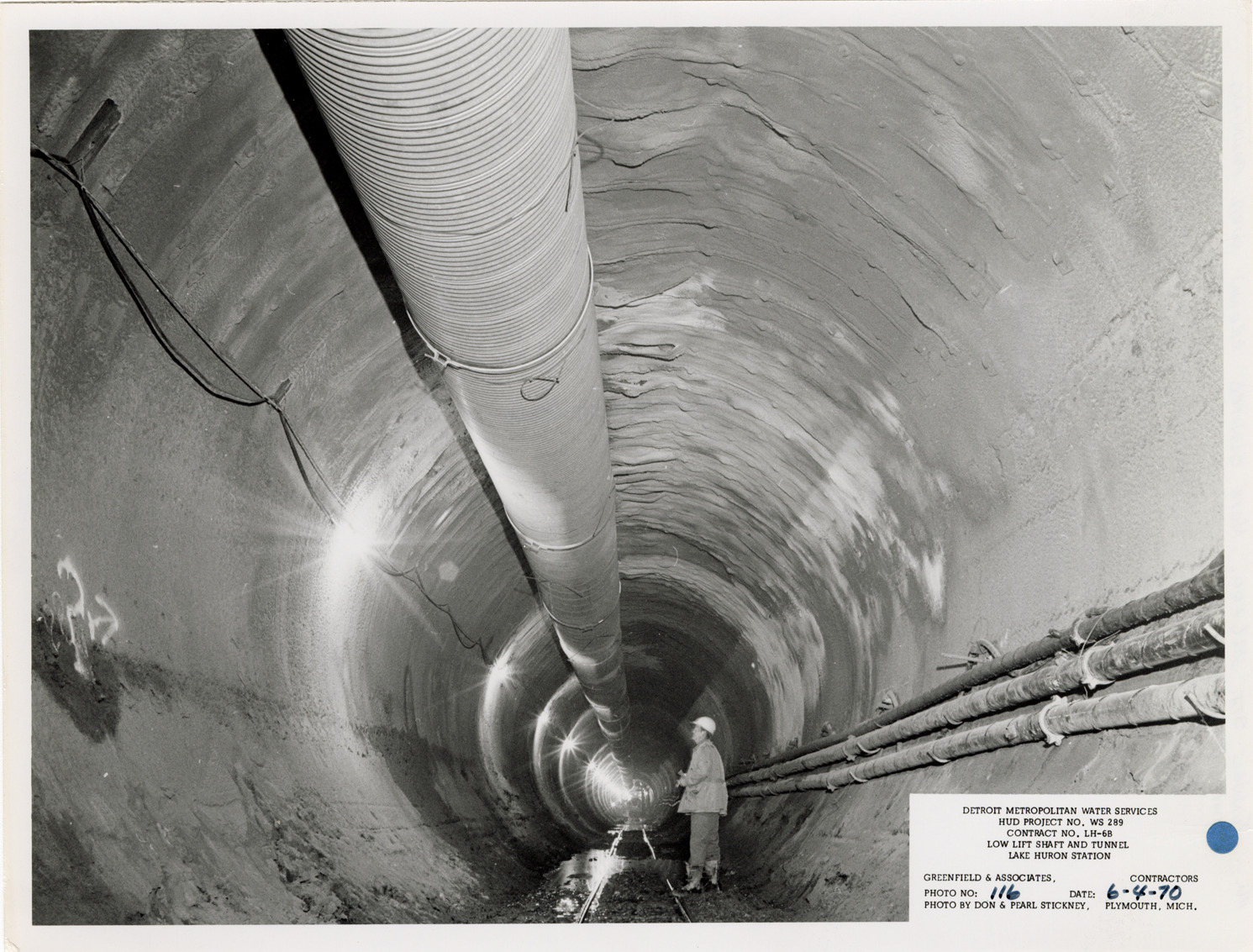 View of worker in tunnel during construction, Lake Huron Station, Detroit water supply system. Printed on front: "Detroit Metropolitan Water Services. HUD Project no. WS 289. Contract no. LH-6B. Low lift shaft and tunnel. Lake Huron Station. Greenfield & Associates, contractors. Photo no: 116. Date: 6-4-70. Photo by Don & Pearl Stickney, Plymouth, Mich." Handwritten on back: "116. Tunnel Sta. 226+00. Note gunited crown over panning and roof bolts."