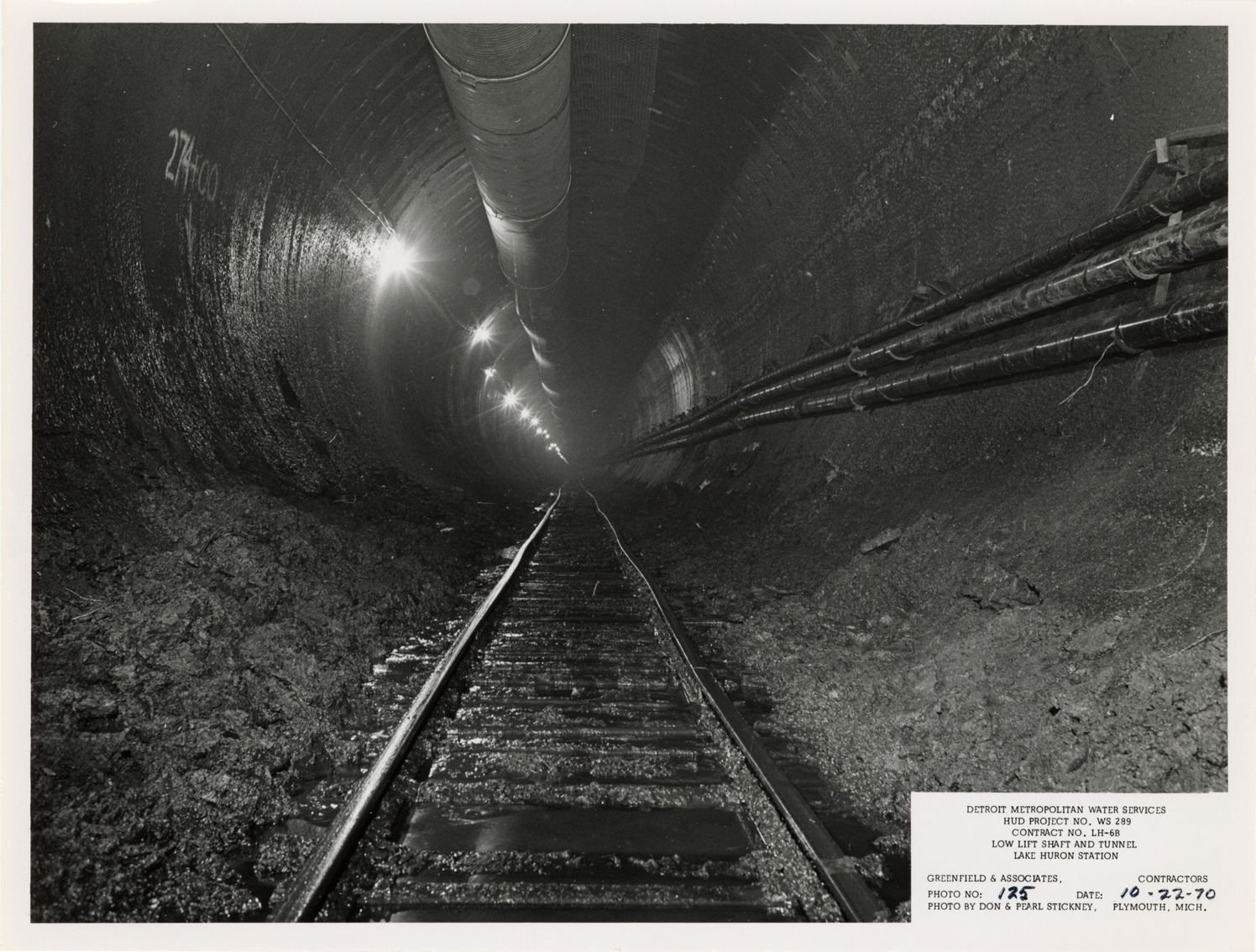 View of tunnel during construction, Lake Huron Station, Detroit water supply system. Printed on front: "Detroit Metropolitan Water Services. HUD Project no. WS 289. Contract no. LH-6B. Low lift shaft and tunnel. Lake Huron Station. Greenfield & Associates, contractors. Photo no: 125. Date: 10-22-70. Photo by Don & Pearl Stickney, Plymouth, Mich."