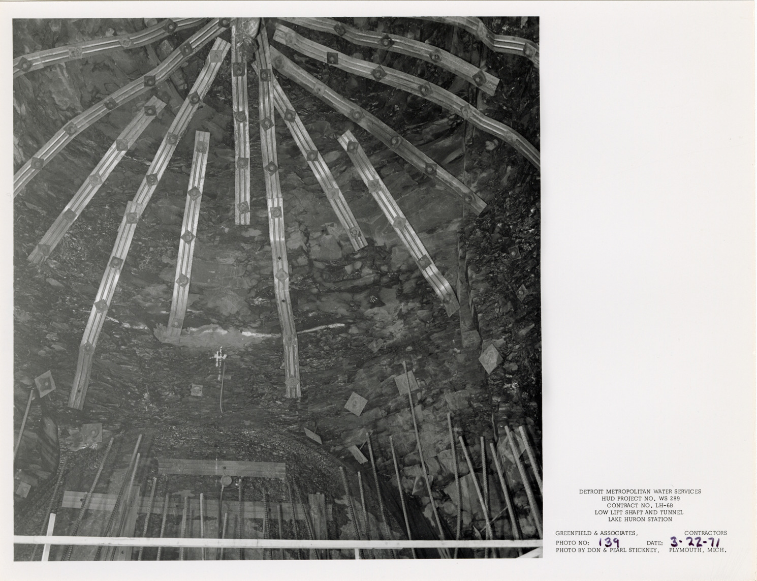 View of tunnel during construction, Lake Huron Station, Detroit water supply system. Printed on front: "Detroit Metropolitan Water Services. HUD Project no. WS 289. Contract no. LH-6B. Low lift shaft and tunnel. Lake Huron Station. Greenfield & Associates, contractors. Photo no: 139. Date: 3-22-71. Photo by Don & Pearl Stickney, Plymouth, Mich."