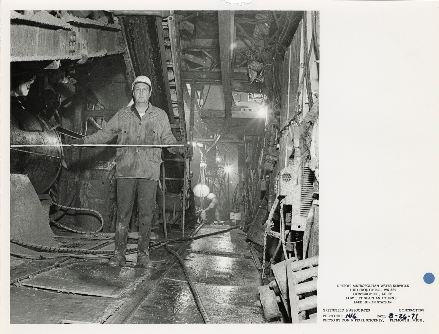 View of worker in tunnel during construction, Lake Huron Station, Detroit water supply system. Printed on front: "Detroit Metropolitan Water Services. HUD Project no. WS 289. Contract no. LH-6B. Low lift shaft and tunnel. Lake Huron Station. Greenfield & Associates, contractors. Photo no: 146. Date: 8-26-71. Photo by Don & Pearl Stickney, Plymouth, Mich."