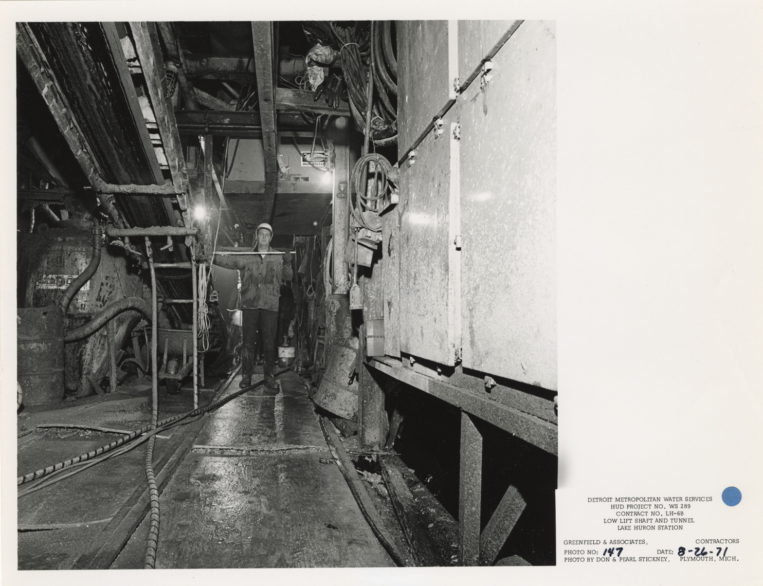 View of worker in tunnel during construction, Lake Huron Station, Detroit water supply system. Printed on front: "Detroit Metropolitan Water Services. HUD Project no. WS 289. Contract no. LH-6B. Low lift shaft and tunnel. Lake Huron Station. Greenfield & Associates, contractors. Photo no: 147. Date: 8-26-71. Photo by Don & Pearl Stickney, Plymouth, Mich."