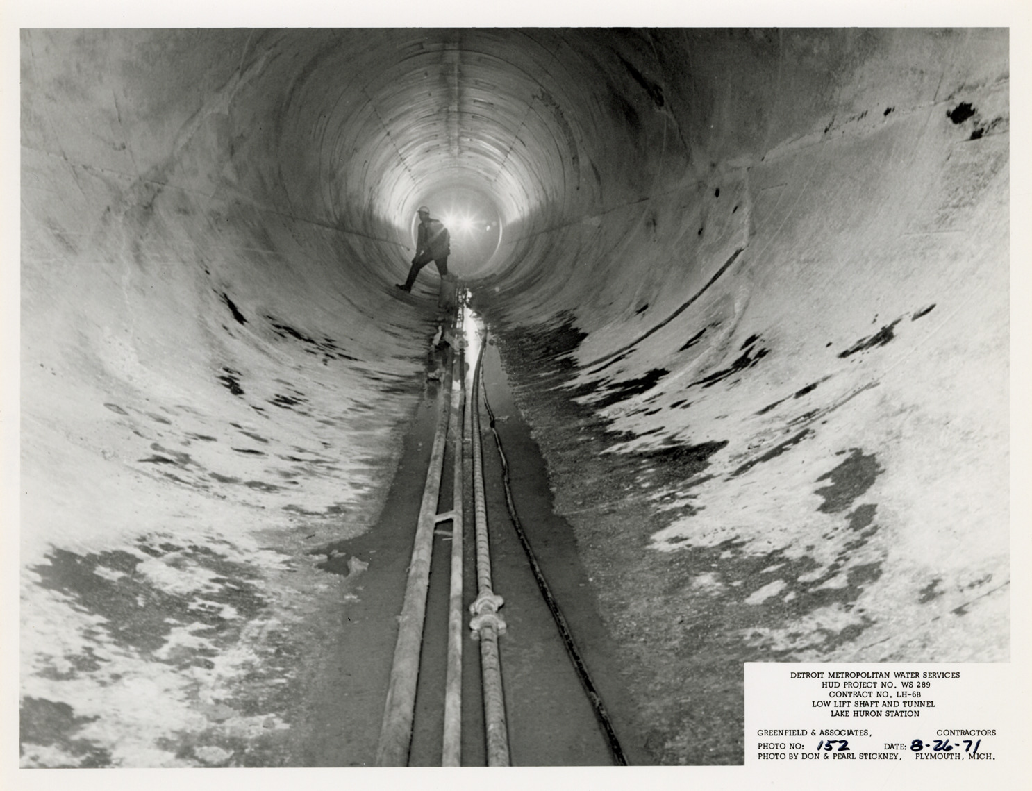 View of worker in tunnel during construction, Lake Huron Station, Detroit water supply system. Printed on front: "Detroit Metropolitan Water Services. HUD Project no. WS 289. Contract no. LH-6B. Low lift shaft and tunnel. Lake Huron Station. Greenfield & Associates, contractors. Photo no: 152. Date: 8-26-71. Photo by Don & Pearl Stickney, Plymouth, Mich."