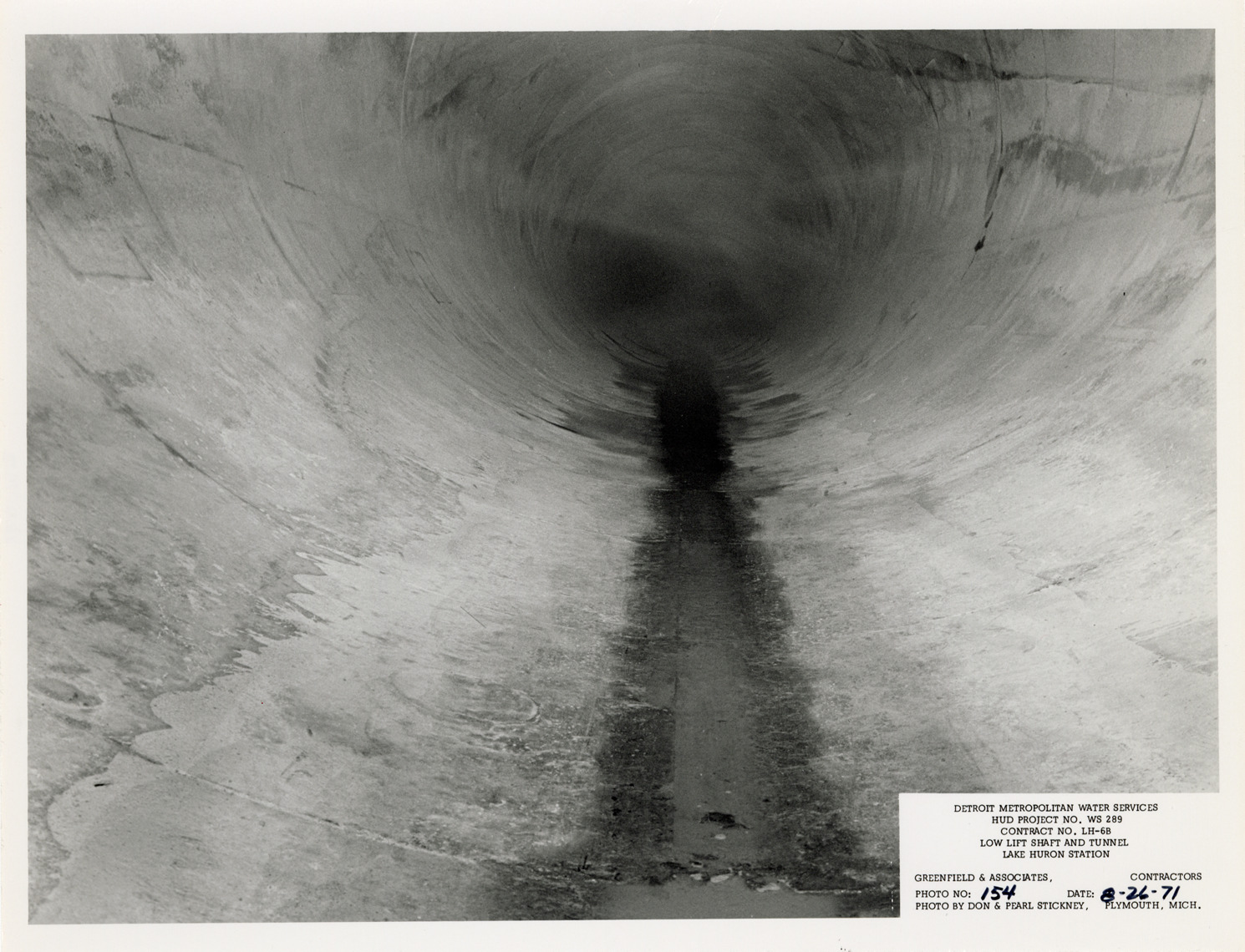 View of tunnel during construction, Lake Huron Station, Detroit water supply system. Printed on front: "Detroit Metropolitan Water Services. HUD Project no. WS 289. Contract no. LH-6B. Low lift shaft and tunnel. Lake Huron Station. Greenfield & Associates, contractors. Photo no: 154. Date: 8-26-71. Photo by Don & Pearl Stickney, Plymouth, Mich."
