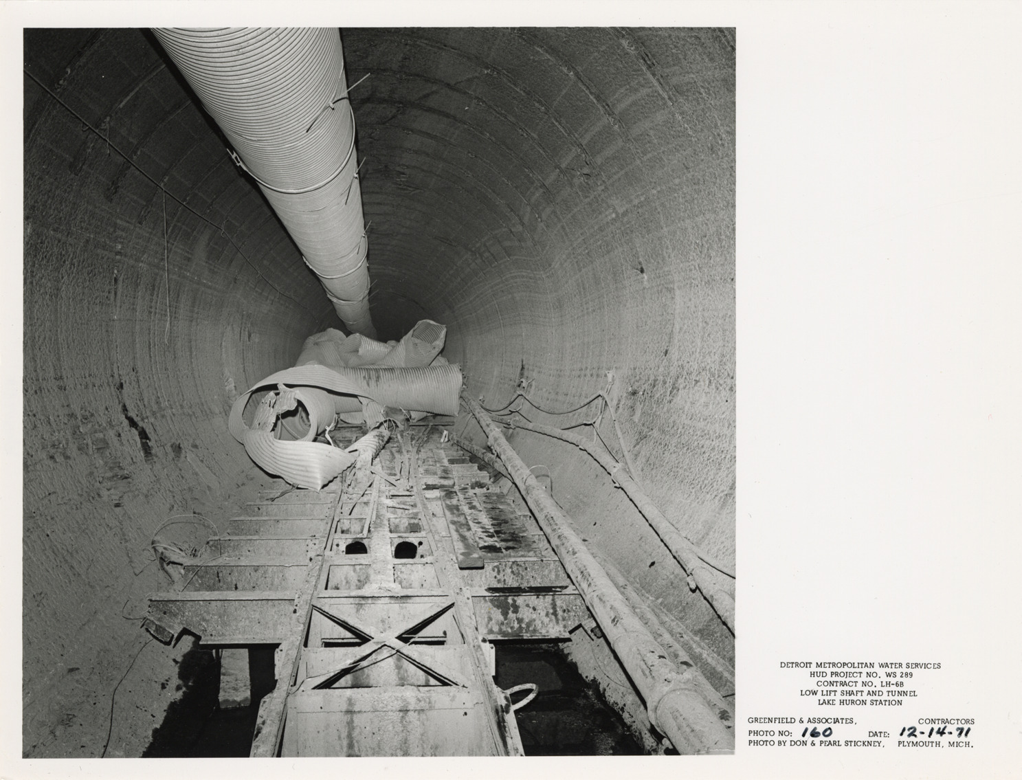 View of tunnel during construction, Lake Huron Station, Detroit water supply system. Printed on front: "Detroit Metropolitan Water Services. HUD Project no. WS 289. Contract no. LH-6B. Low lift shaft and tunnel. Lake Huron Station. Greenfield & Associates, contractors. Photo no: 160. Date: 12-14-71. Photo by Don & Pearl Stickney, Plymouth, Mich."