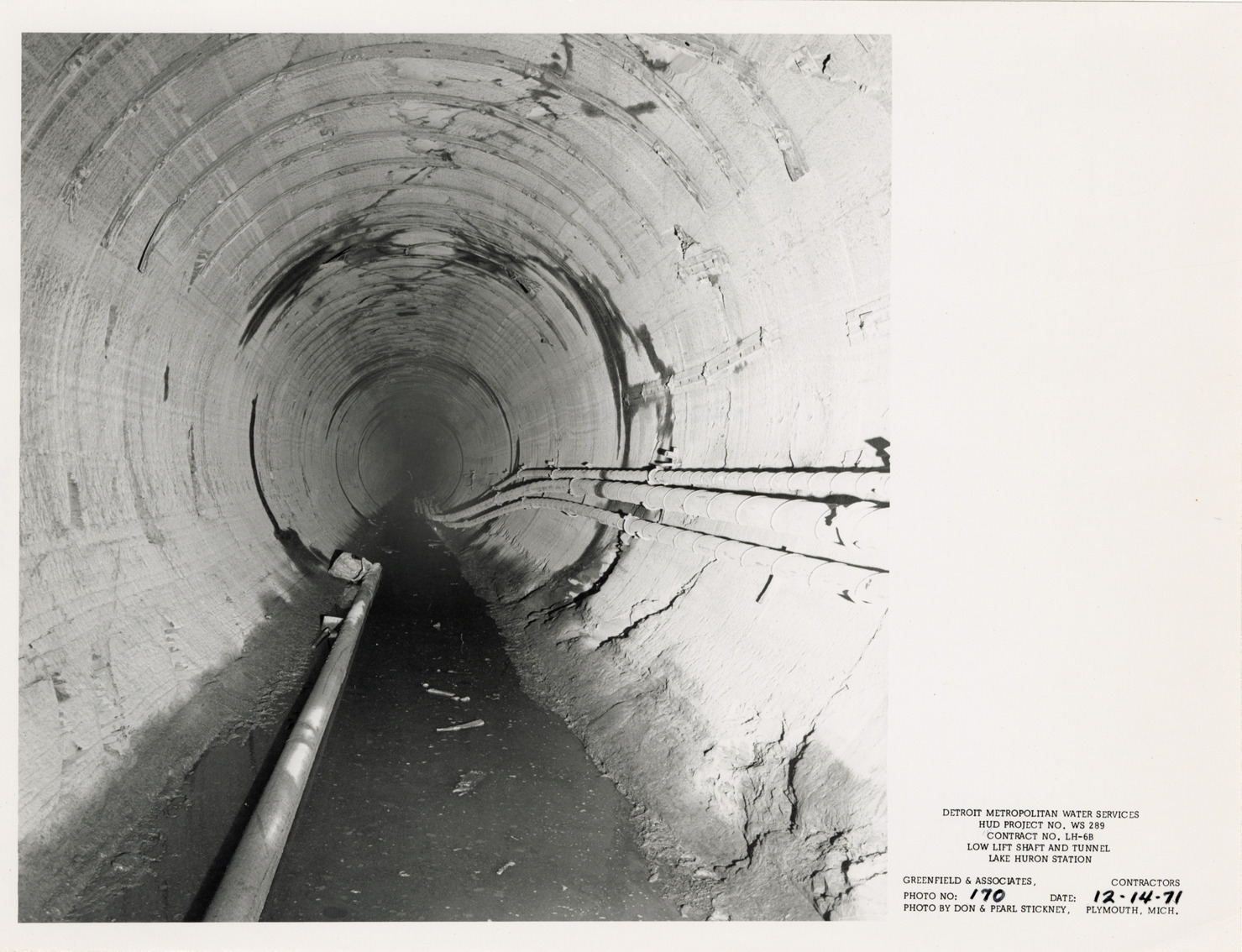 View of tunnel during construction, Lake Huron Station, Detroit water supply system. Printed on front: "Detroit Metropolitan Water Services. HUD Project no. WS 289. Contract no. LH-6B. Low lift shaft and tunnel. Lake Huron Station. Greenfield & Associates, contractors. Photo no: 170. Date: 12-14-71. Photo by Don & Pearl Stickney, Plymouth, Mich."