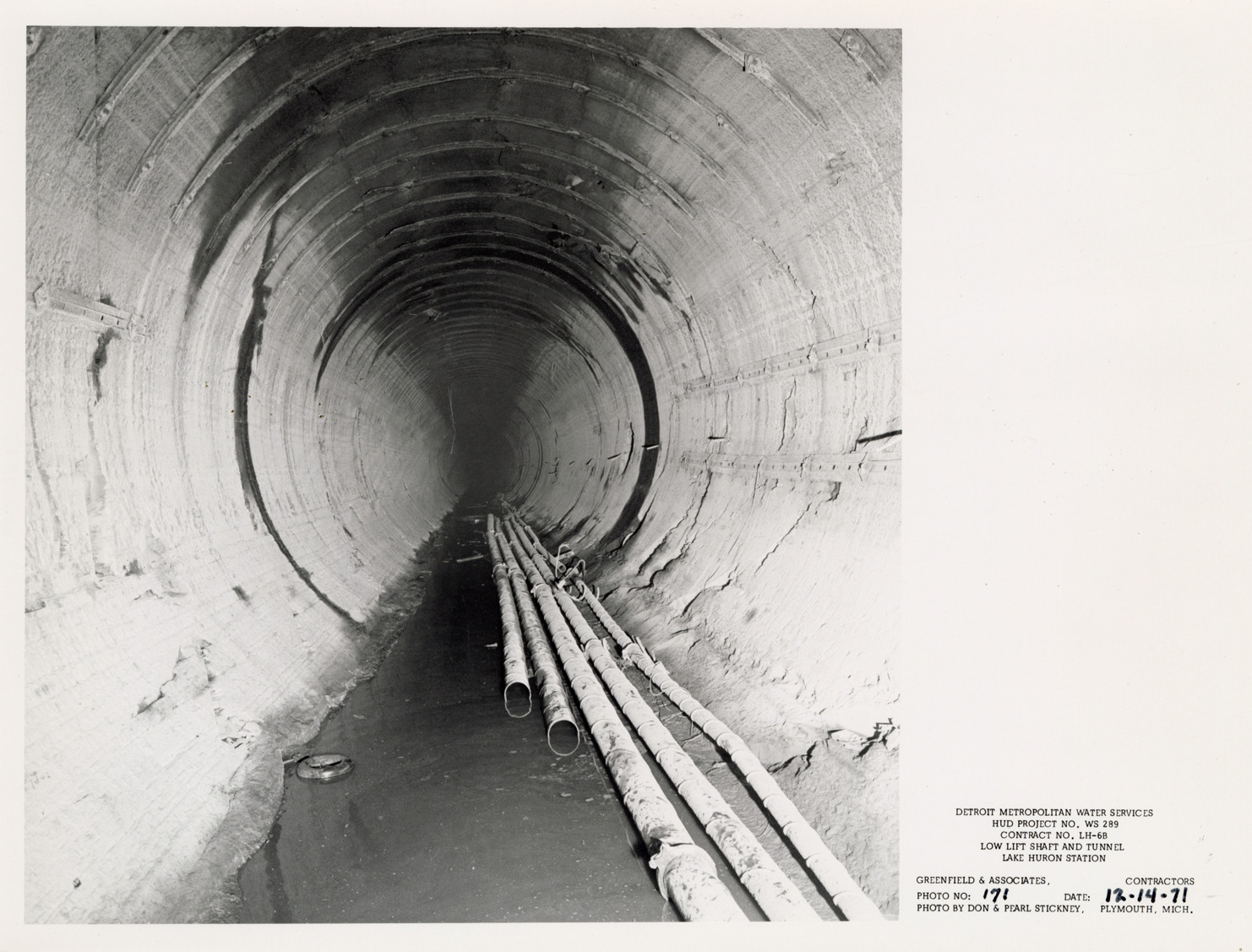 View of tunnel during construction, Lake Huron Station, Detroit water supply system. Printed on front: "Detroit Metropolitan Water Services. HUD Project no. WS 289. Contract no. LH-6B. Low lift shaft and tunnel. Lake Huron Station. Greenfield & Associates, contractors. Photo no: 171. Date: 12-14-71. Photo by Don & Pearl Stickney, Plymouth, Mich."