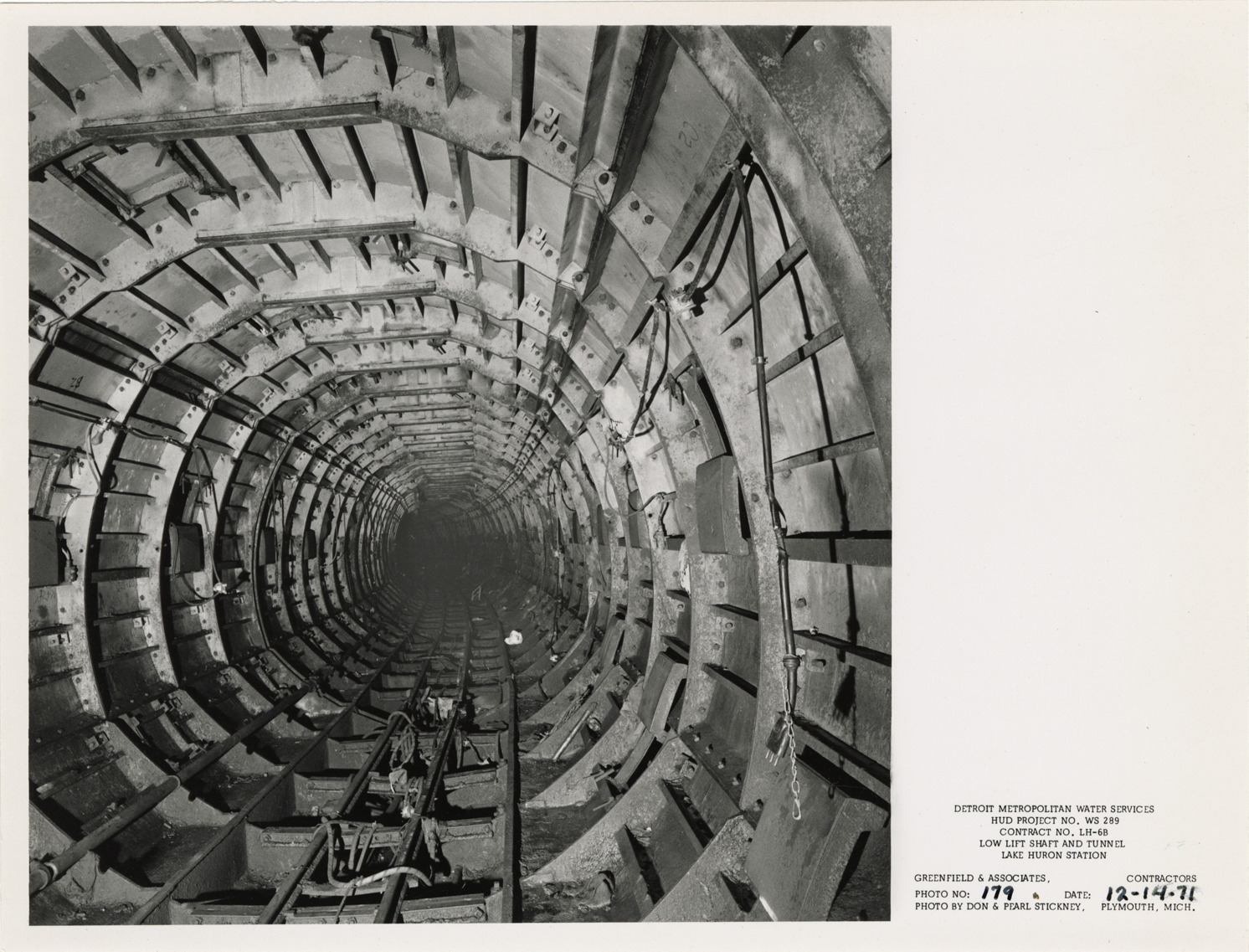 View of tunnel during construction, Lake Huron Station, Detroit water supply system. Printed on front: "Detroit Metropolitan Water Services. HUD Project no. WS 289. Contract no. LH-6B. Low lift shaft and tunnel. Lake Huron Station. Greenfield & Associates, contractors. Photo no: 179. Date: 12-14-71. Photo by Don & Pearl Stickney, Plymouth, Mich."