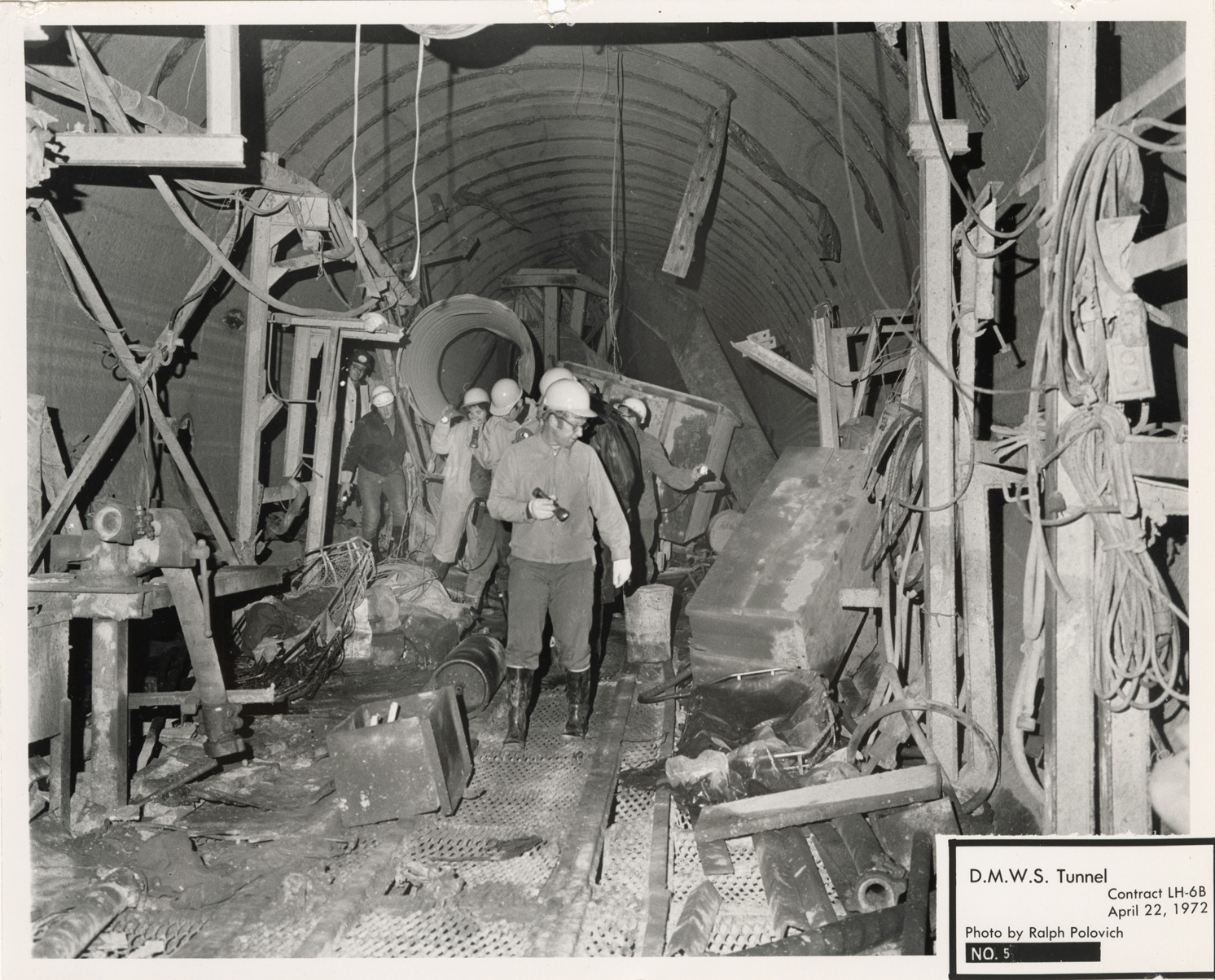 View of workers in tunnel during construction, Lake Huron Station, Detroit water supply system. Printed on front: "D.M.W.S. tunnel. Contract LH-6B. No. 5. April 22, 1972. Photo by Ralph Polovich."