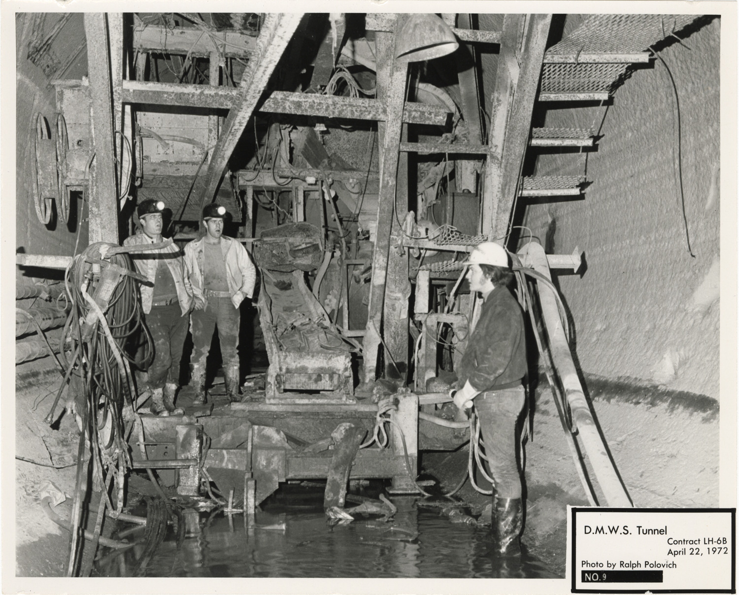 View of workers in tunnel during construction, Lake Huron Station, Detroit water supply system. Printed on front: "D.M.W.S. tunnel. Contract LH-6B. No. 9. April 22, 1972. Photo by Ralph Polovich."