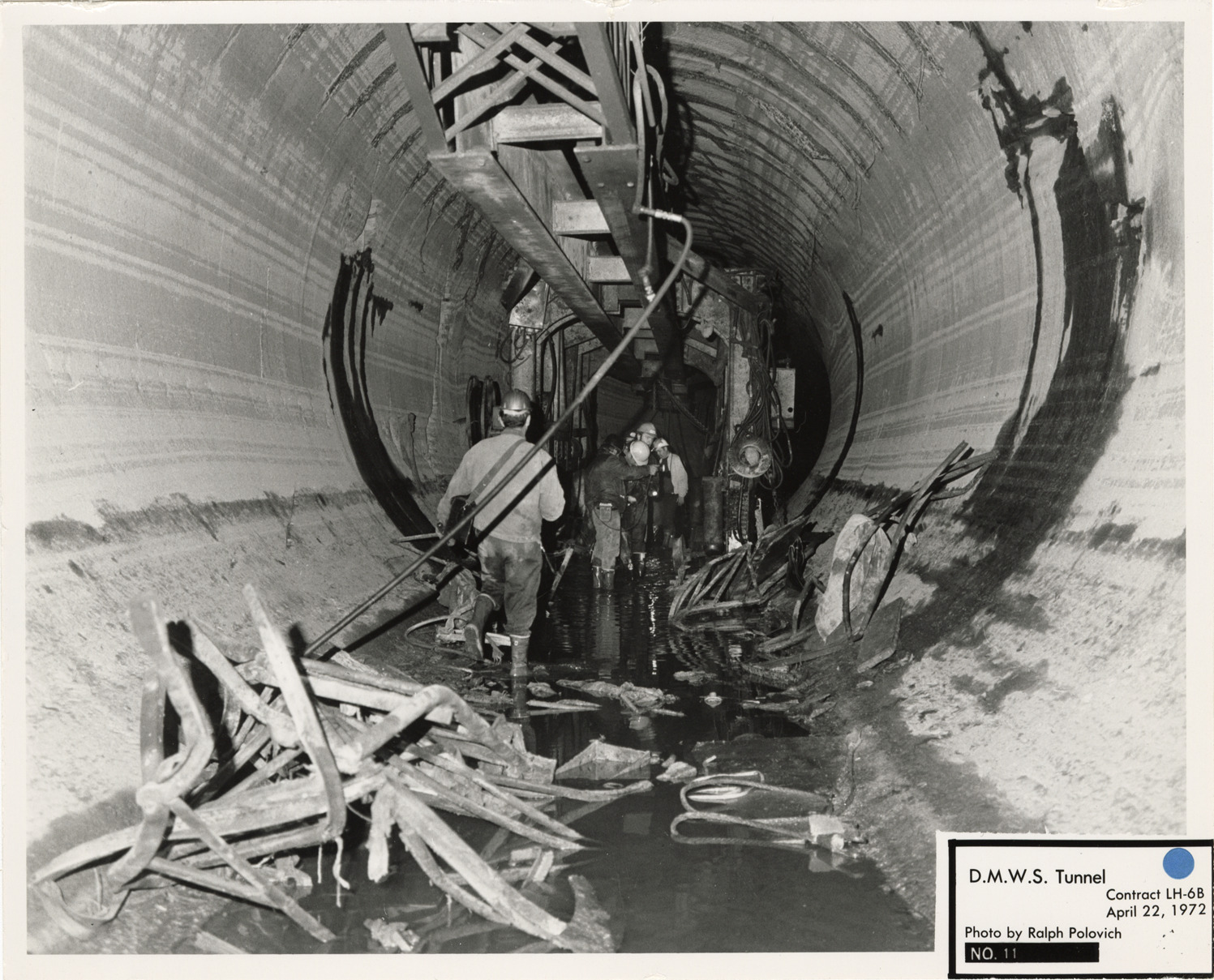 View of workers in tunnel during construction, Lake Huron Station, Detroit water supply system. Printed on front: "D.M.W.S. tunnel. Contract LH-6B. No. 11. April 22, 1972. Photo by Ralph Polovich."