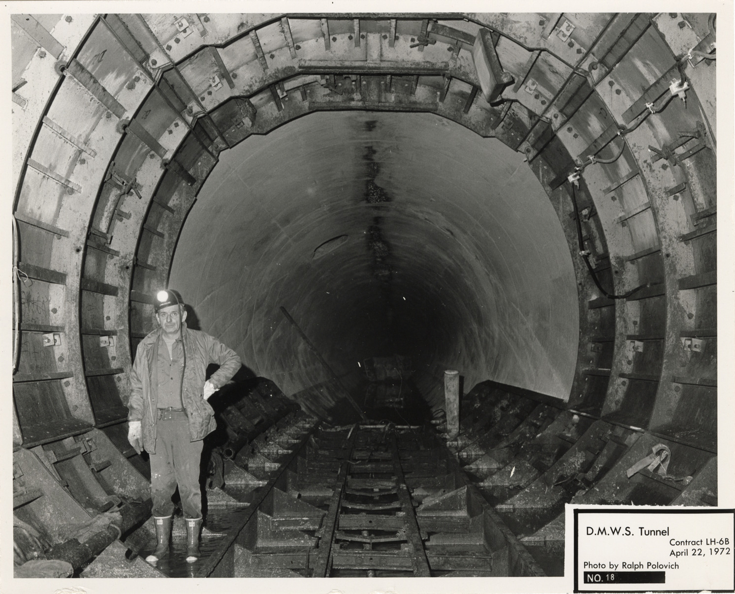 View of worker in tunnel during construction, Lake Huron Station, Detroit water supply system. Printed on front: "D.M.W.S. tunnel. Contract LH-6B. No. 18. April 22, 1972. Photo by Ralph Polovich."