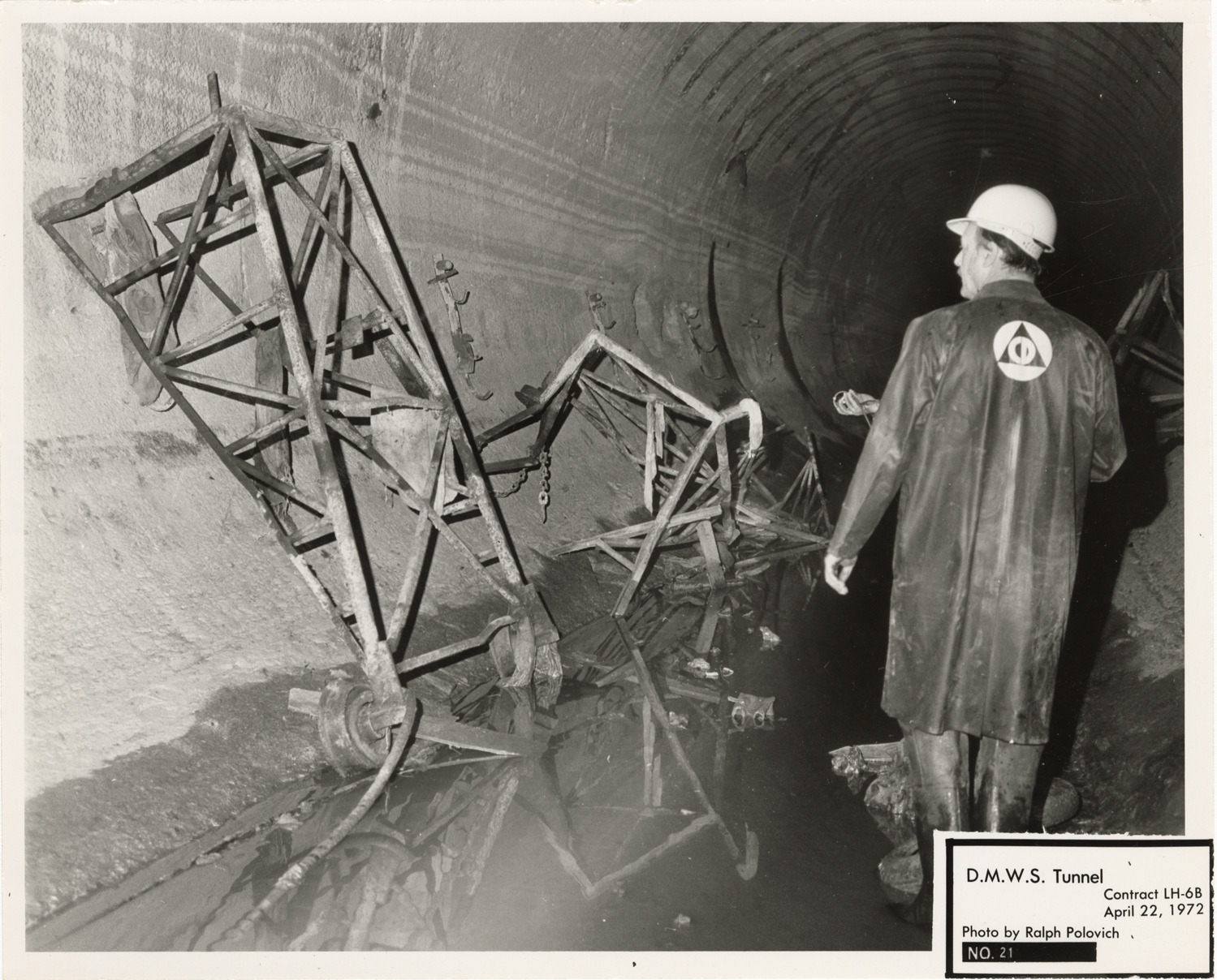 View of worker in tunnel during construction, Lake Huron Station, Detroit water supply system. Printed on front: "D.M.W.S. tunnel. Contract LH-6B. No. 21. April 22, 1972. Photo by Ralph Polovich."