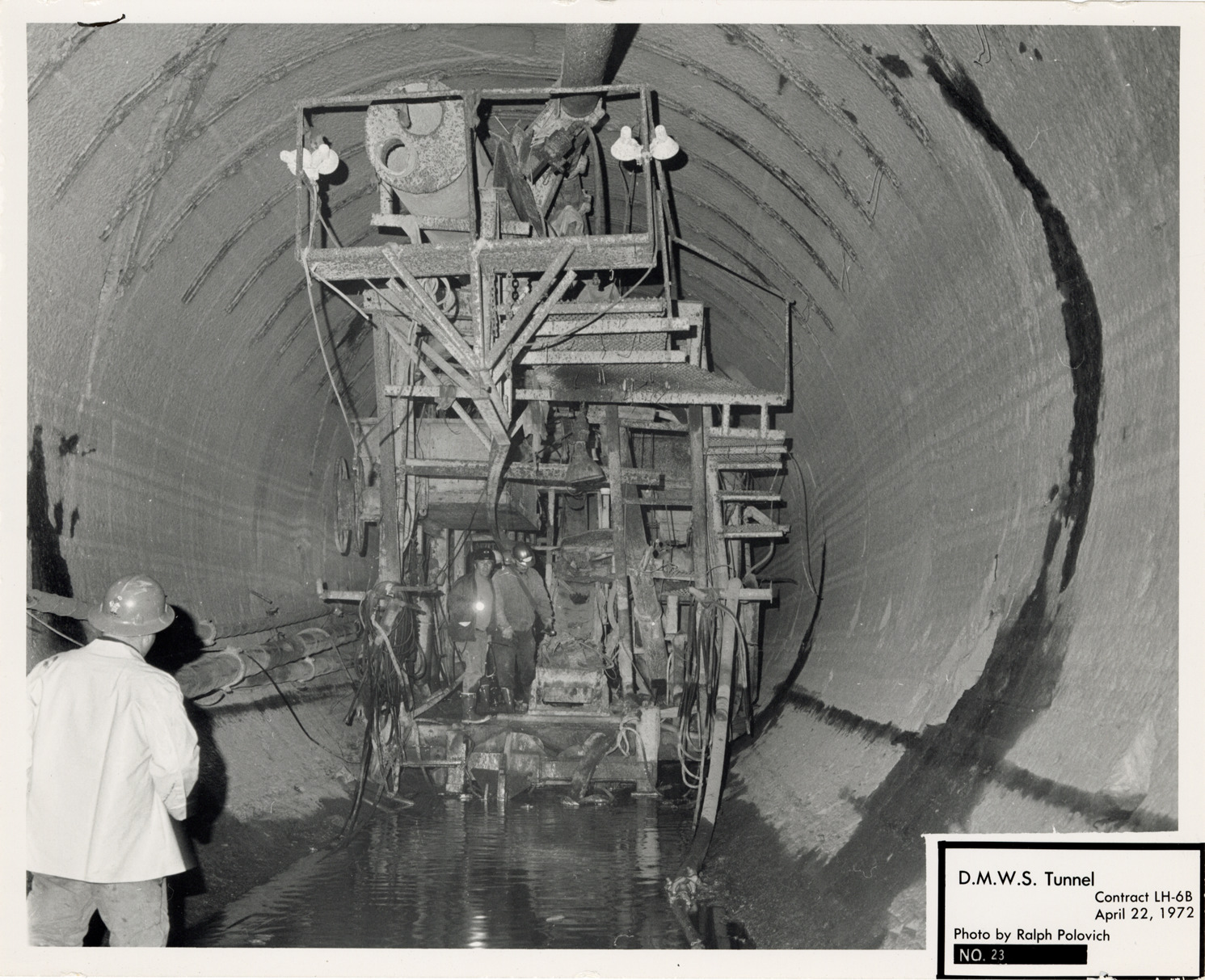 View of workers in tunnel during construction, Lake Huron Station, Detroit water supply system. Printed on front: "D.M.W.S. tunnel. Contract LH-6B. No. 23. April 22, 1972. Photo by Ralph Polovich."