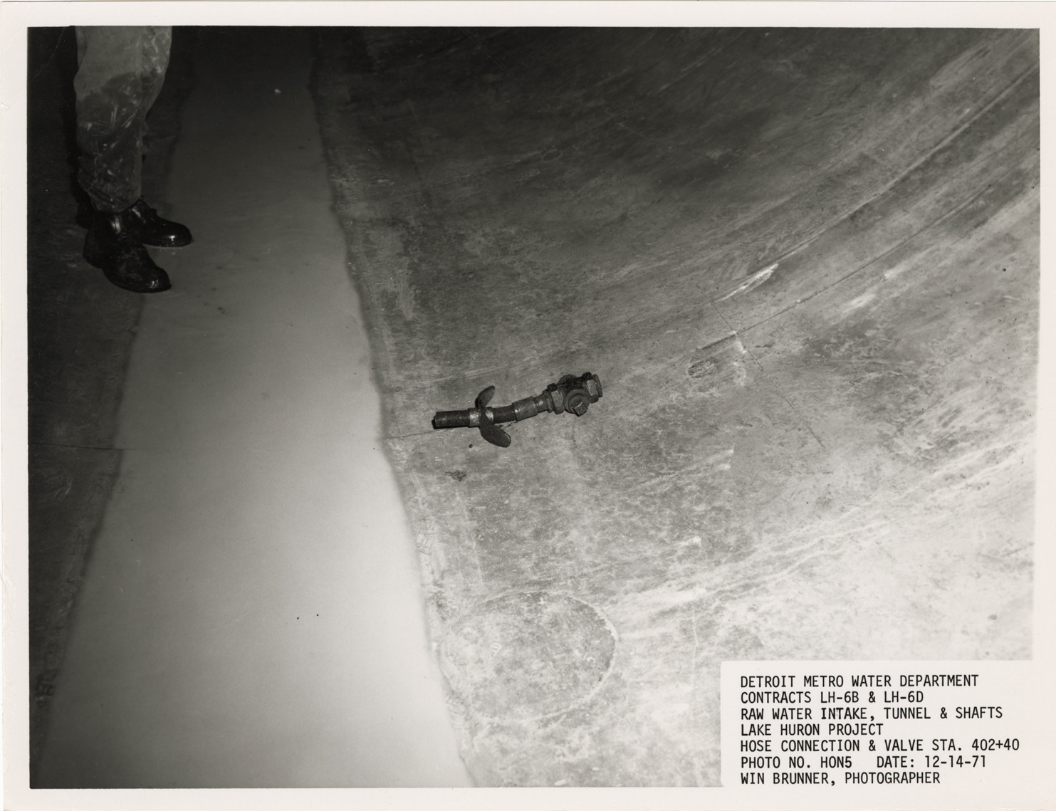 View of hose connection and valve in tunnel during construction, Lake Huron Station, Detroit water supply system. Printed on front: "Detroit Metro Water Department. Contracts LH-6B & LH-6D. Raw water intake, tunnel & shafts. Lake Huron Project. Hose connection & valve Sta. 402+40. Photo no. H0N5. Date: 12-14-71. Win Brunner, photographer."