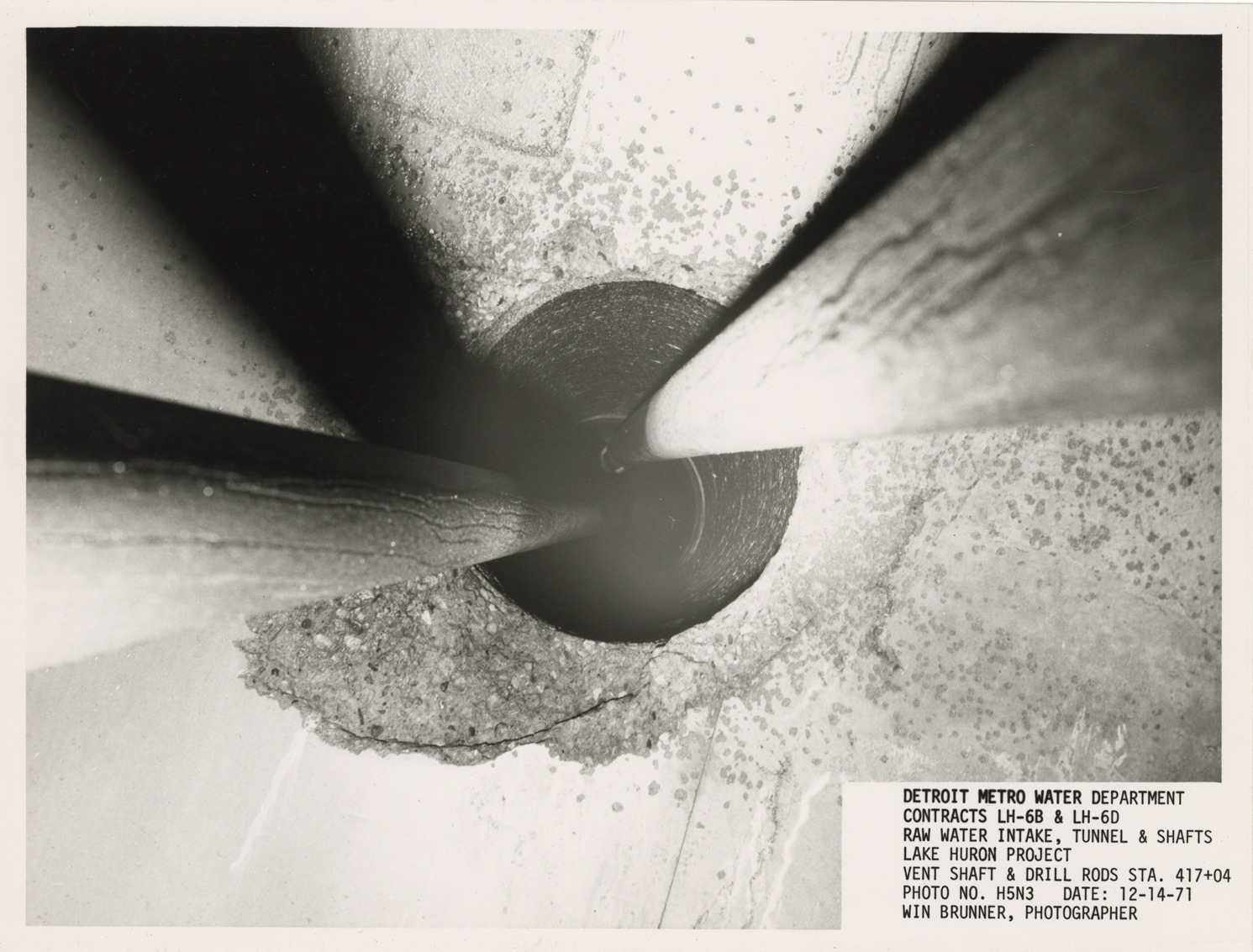 View of drill rods in vent shaft, Lake Huron Station, Detroit water supply system. Printed on front: "Detroit Metro Water Department. Contracts LH-6B & LH-6D. Raw water intake, tunnel & shafts. Lake Huron Project. Vent shaft & drill rods Sta. 417+04. Photo no. H5N3. Date: 12-14-71. Win Brunner, photographer."