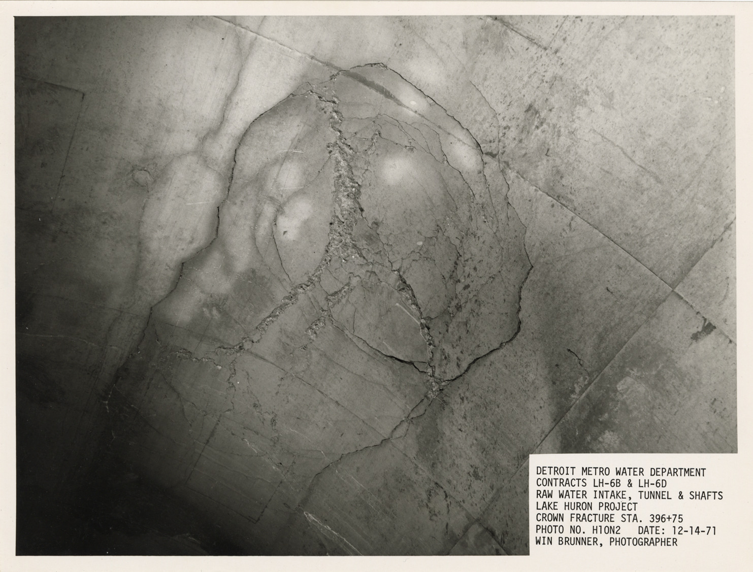 View of crown fracture in tunnel during construction, Lake Huron Station, Detroit water supply system. Printed on front: "Detroit Metro Water Department. Contracts LH-6B & LH-6D. Raw water intake, tunnel & shafts. Lake Huron Project. Crown fracture Sta. 396+75. Photo no. H10N2. Date: 12-14-71. Win Brunner, photographer."