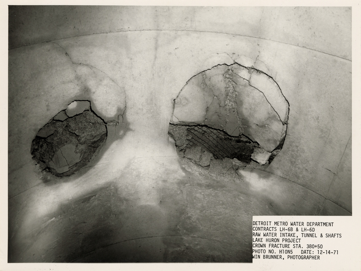 View of crown fracture in tunnel during construction, Lake Huron Station, Detroit water supply system. Printed on front: "Detroit Metro Water Department. Contracts LH-6B & LH-6D. Raw water intake, tunnel & shafts. Lake Huron Project. Crown fracture Sta. 380+50. Photo no. H10N5. Date: 12-14-71. Win Brunner, photographer."