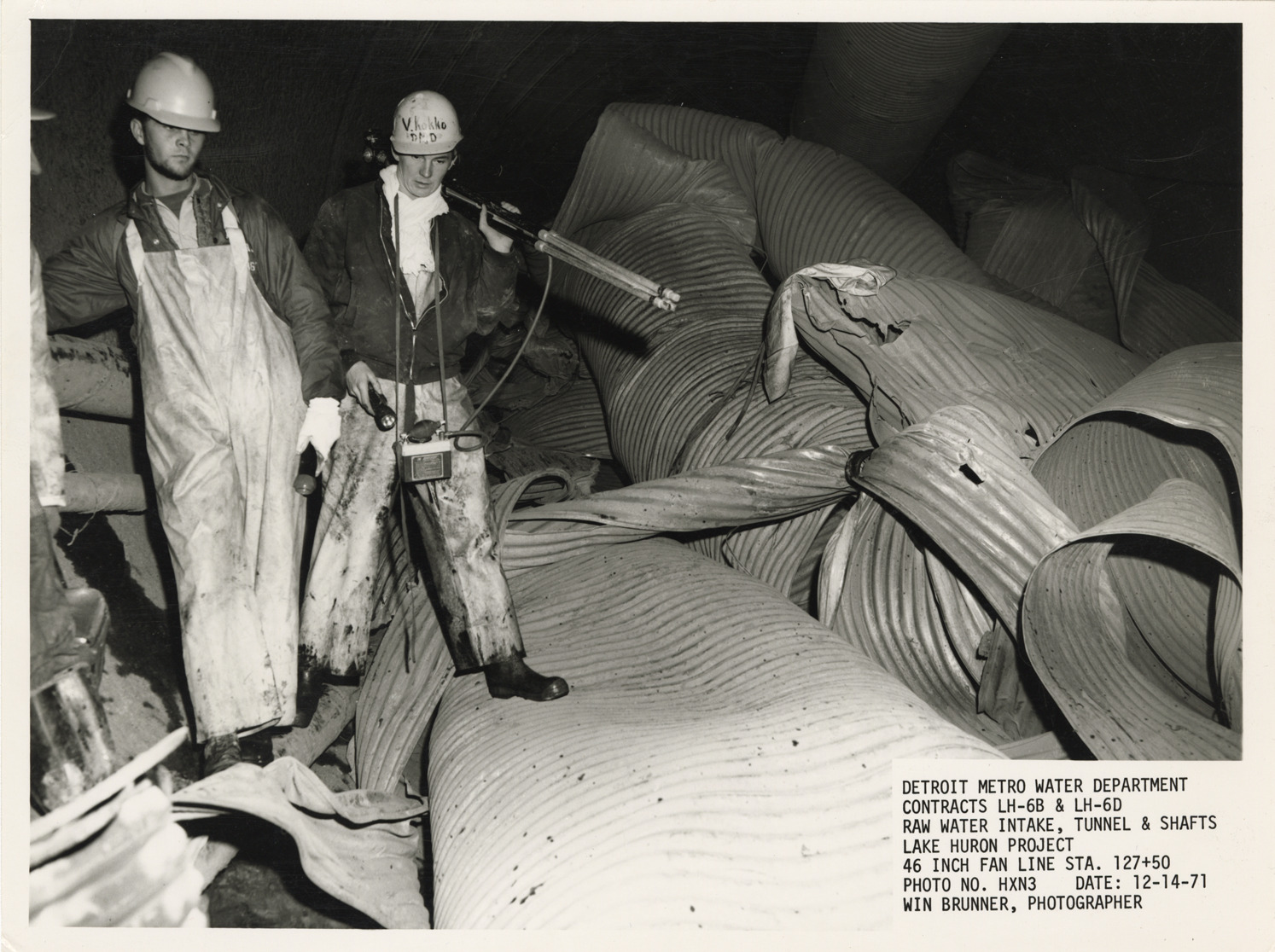 View of workers with fan line, Lake Huron Station, Detroit water supply system. Printed on front: "Detroit Metro Water Department. Contracts LH-6B & LH-6D. Raw water intake, tunnel & shafts. Lake Huron Project. 46 inch fan line Sta. 127+50. Photo no. HXN3. Date: 12-14-71. Win Brunner, photographer."