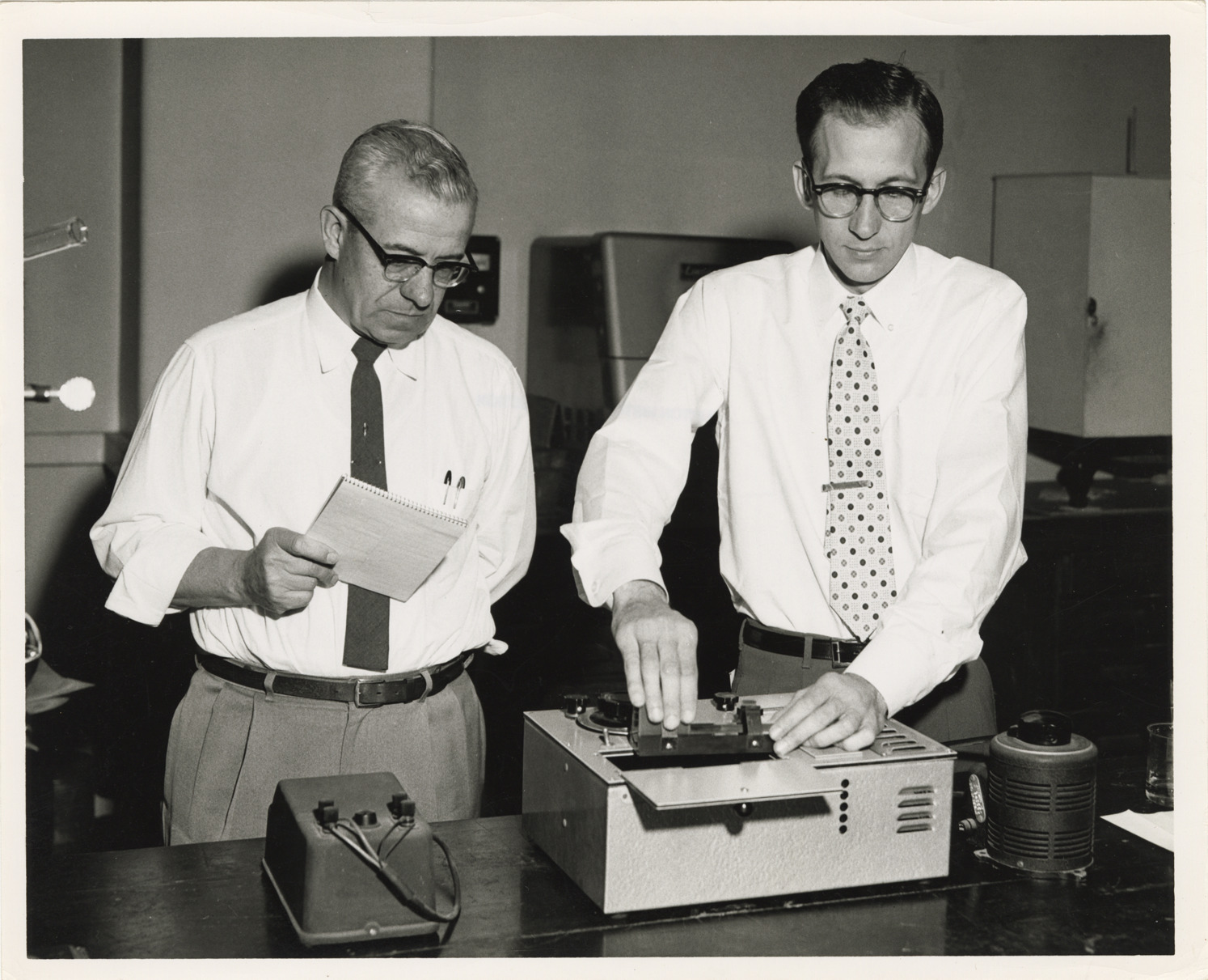 View of two men with unidentified equipment in laboratory, Waterworks Park, Detroit water supply system. Handwritten on back: "Water Works Park, laboratory."