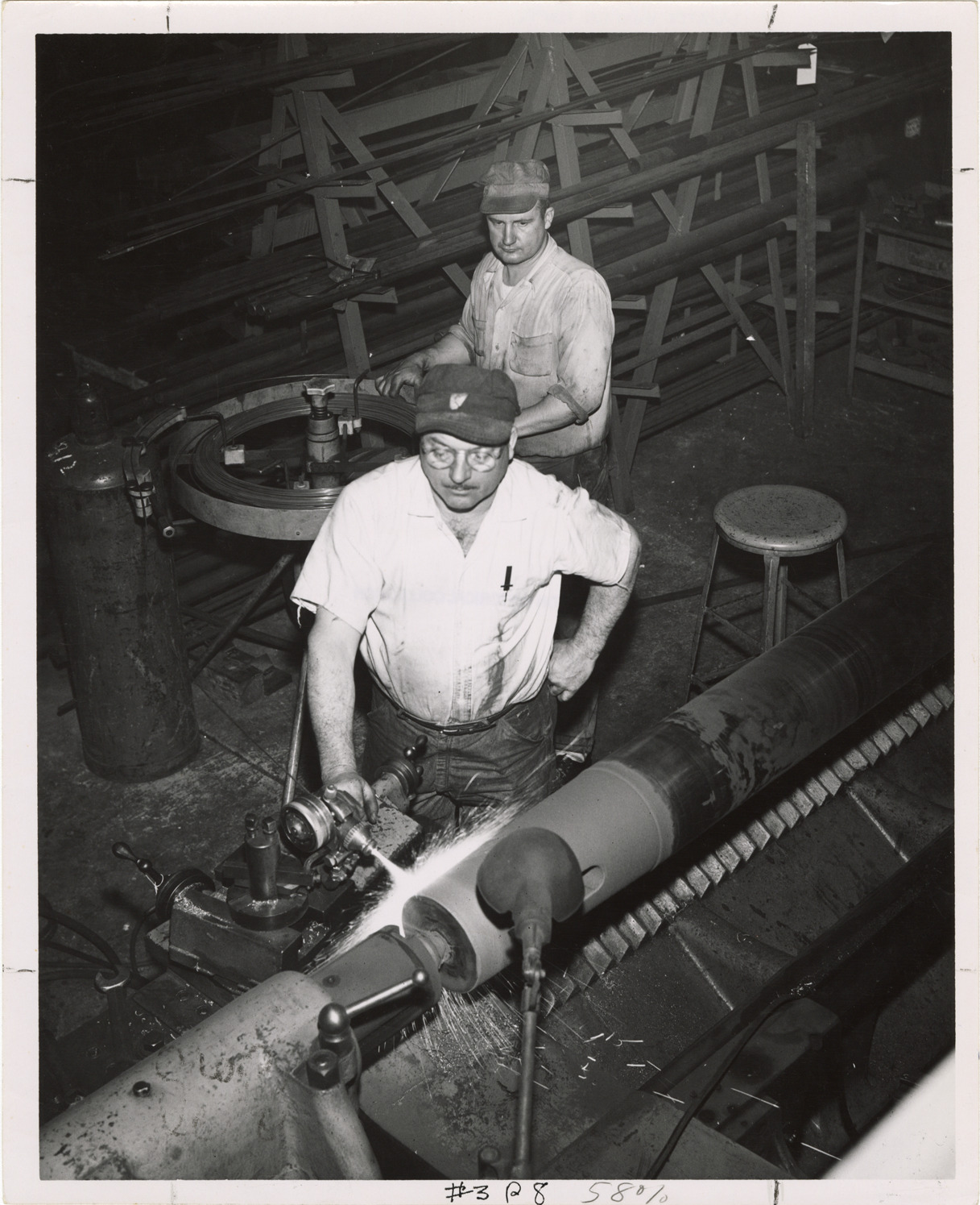 Workers using metallizing equipment in machine shop, Waterworks Park, Detroit water supply system