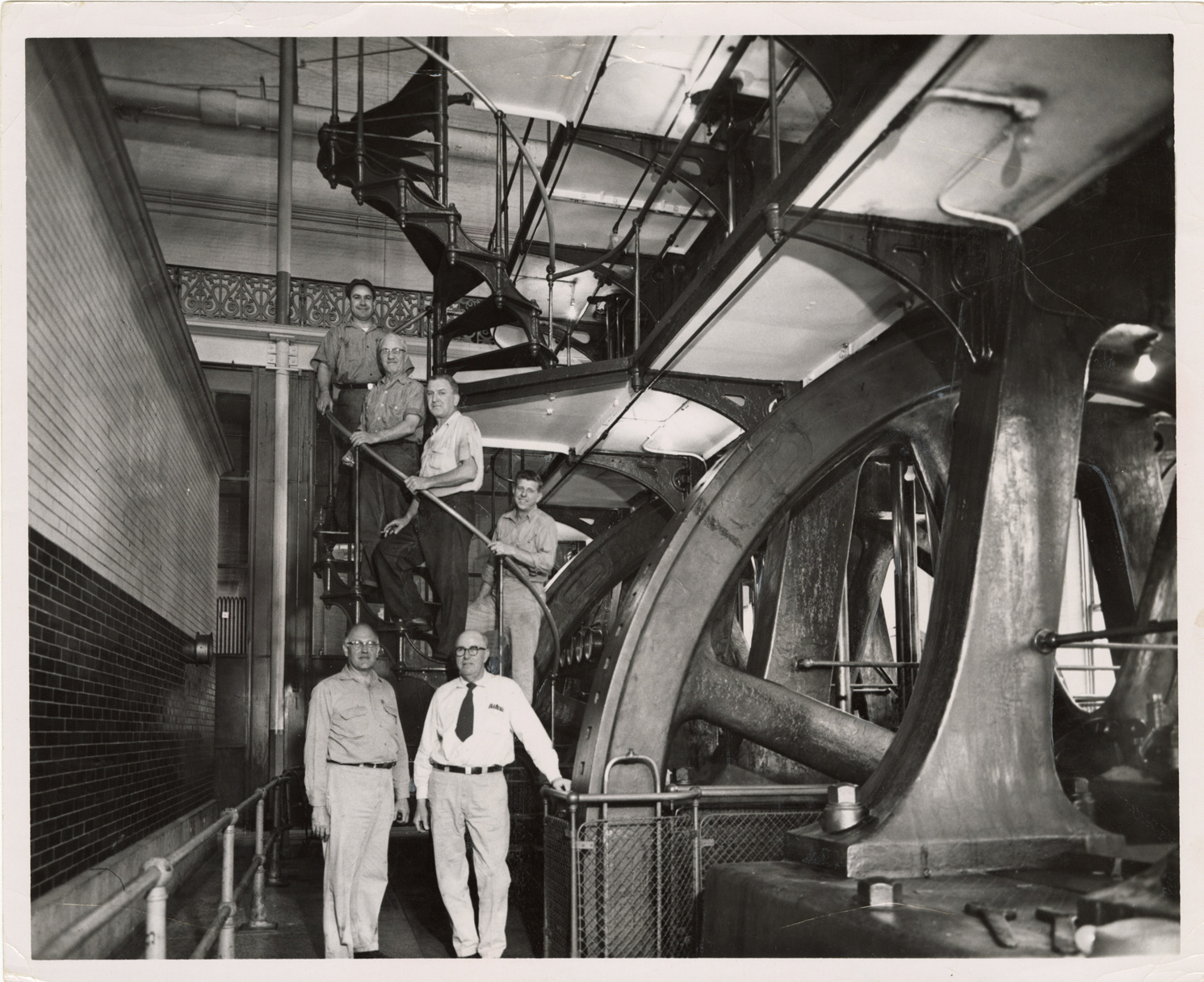 View of Fred Burns, Ken Snyder and other workers posing with pump at Waterworks Park, Detroit water supply system. Handwritten on back: "[undecipherable] pump, Waterworks Park. Workers: Fred Burns, Ken Snyder."