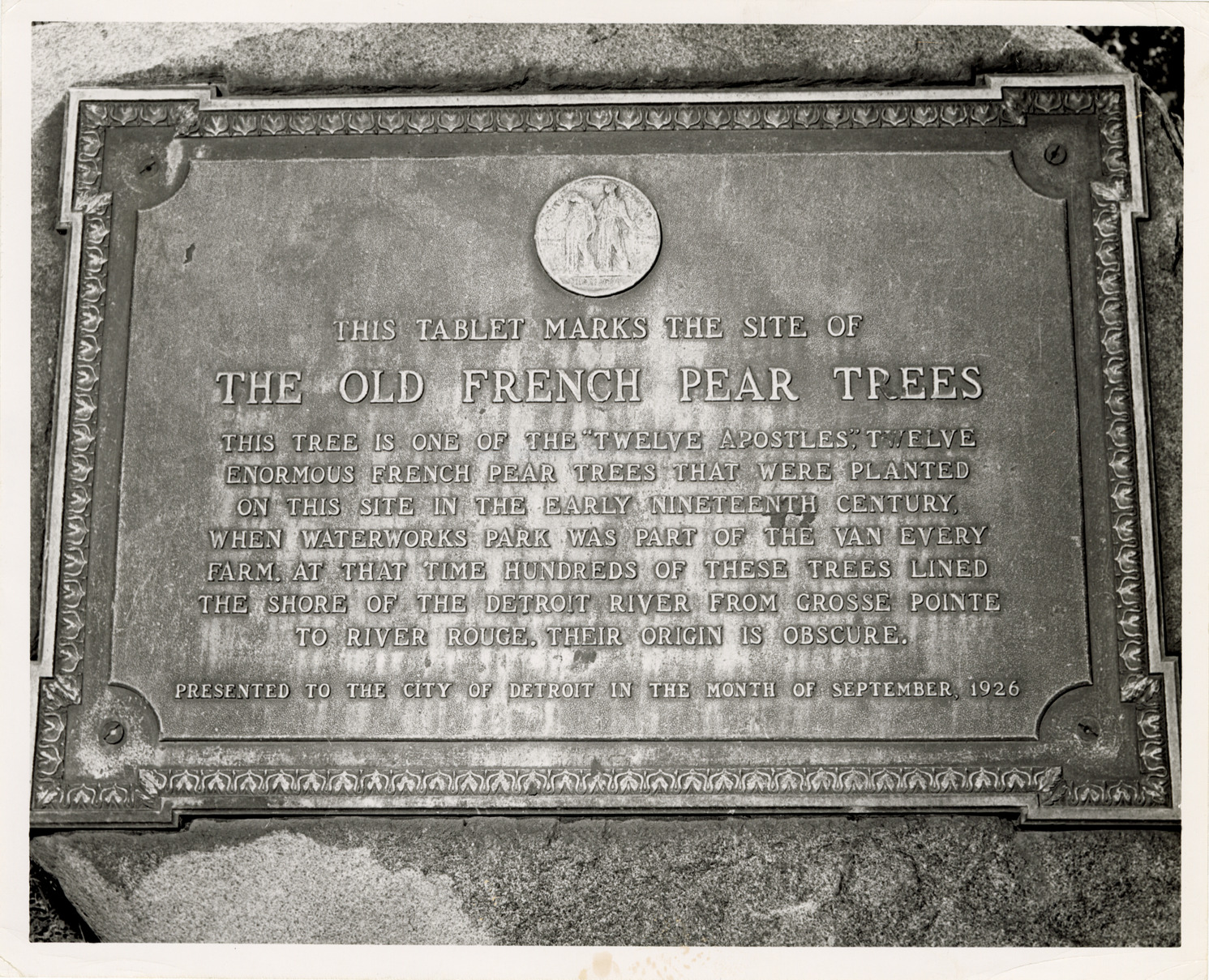 View of bronze tablet for old French pear trees at Waterworks Park. Inscription reads: "This tablet marks the site of the old French pear trees. This tree is one of the 'twelve apostles,' twelve enourmous French pear trees that were planted on this site in the early nineteenth century when Waterworks Park was part of the Van Every farm. At that time hundreds of these trees lined the shore of the Detroit River from Grosse Pointe to River Rouge. Their origin is obscure. Presented to the city of Detroit in the month of September 1926." Handwritten on back: "Water Works Park."