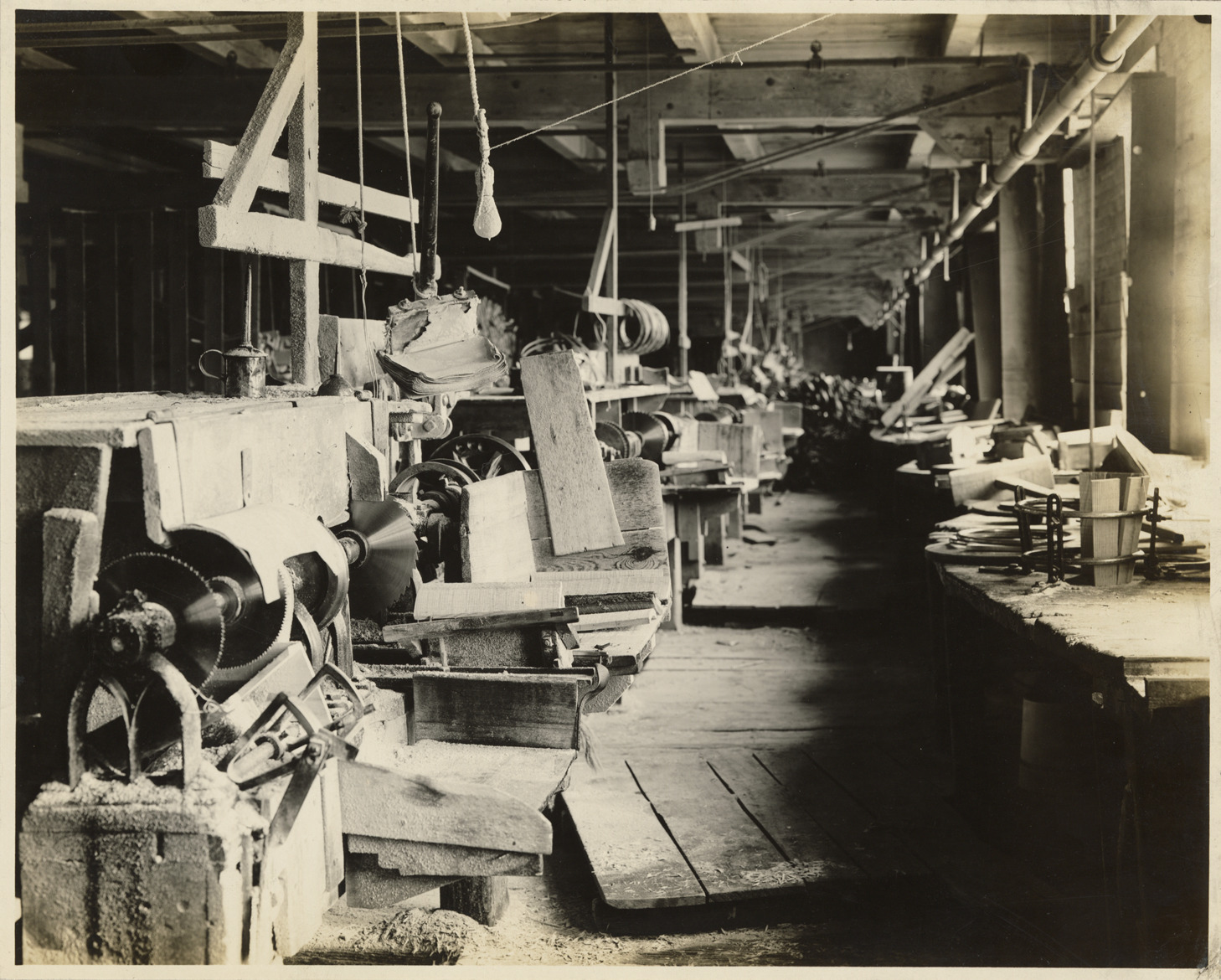 View of woodworking machinery at Bousfield & Co., a woodenware manufacturer in Bay City, Michigan. Partially assembled pails on right. Tab on photograph: "This photo made April 2, 1911 at Bousfield and Co. Frank H. Shearer, photographer. Bay City, Mich."