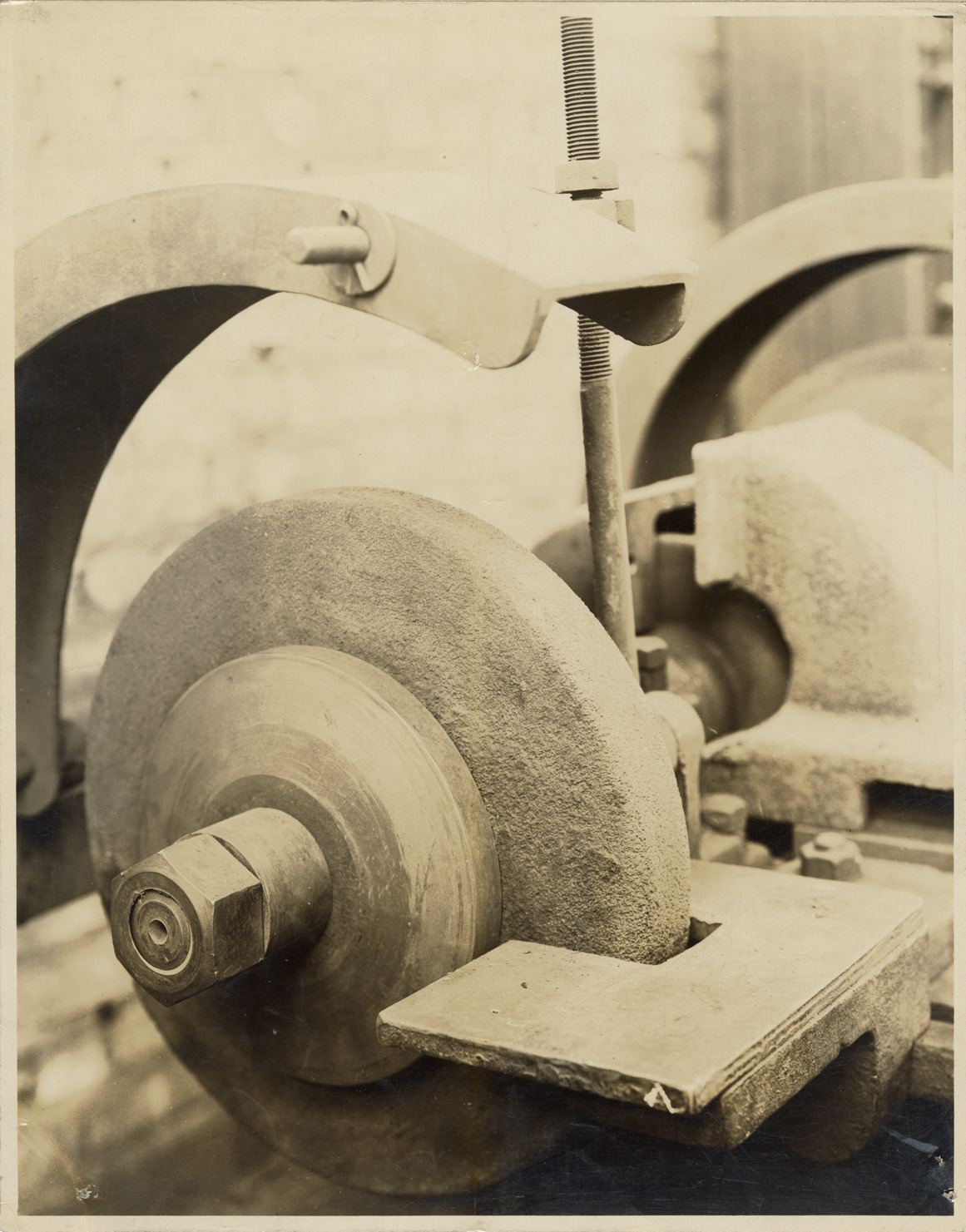 Close-up view of emery wheel on grinding and polishing machine at the Industrial Works factory in Bay City, Michigan. Tab on photograph: "This photo made May 30, 1912 at Industrial Works, Bay City. Emery wheel is 15" in diameter. Space between wheel and tool-rest 5/8". Frank H. Shearer, photographer, Bay City, Mich."