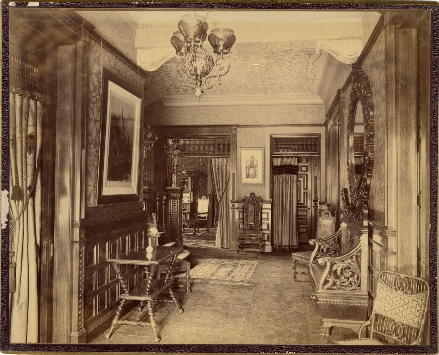 View of the foyer of the Edward Smith residence. Room is furnished with chairs, table and mirror. Artwork is displayed on walls; staircase on left. Curtained doorways to other rooms in background. Printed on back: "Tomlinson, photographer, 236 Woodward Ave., Detroit, Mich."