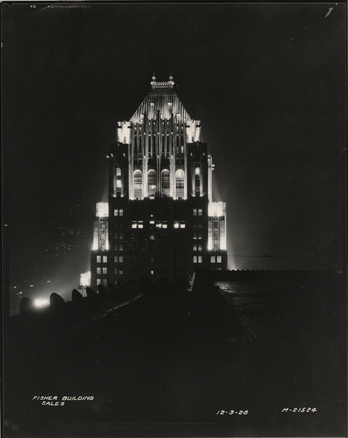 Favorite this☆ Fisher Building at night Description: Nighttime view of the Fisher Building. Building was designed by Albert Kahn. Printed on front: "Fisher Building, Sales. 12-3-28." Details Resource ID: bh017702 Subject: Office buildings--Michigan--Detroit Kahn, Albert, 1869-1942 Photographic prints Date Issued: 1928-12-03 Format: 1 photographic print ; 10 x 8 in. Member of: Burton Historical Collection Filing Location: D/Buildings-Fisher Rights: Physical rights are retained by DPL. Copyright is retained in accordance with U.S. copyright laws.