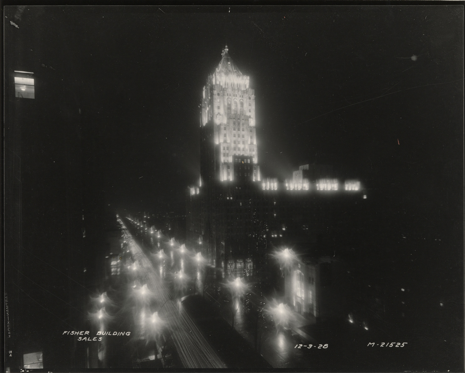 Favorite this☆ Fisher Building at night Description: Nighttime view of the Fisher Building. Building was designed by Albert Kahn. Printed on front: "Fisher Building, Sales. 12-3-28." Details Resource ID: bh017704 Subject: Office buildings--Michigan--Detroit Kahn, Albert, 1869-1942 Photographic prints Date Issued: 1928-12-03 Format: 1 photographic print ; 8 x 10 in. Member of: Burton Historical Collection Filing Location: D/Buildings-Fisher Rights: Physical rights are retained by DPL. Copyright is retained in accordance with U.S. copyright laws.