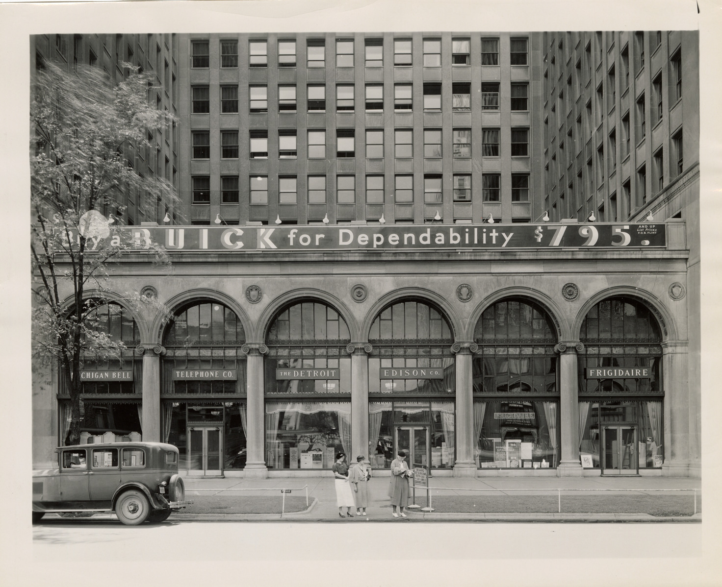 View of women waiting on sidewalk in front of the General Motors Building, located on Grand Boulevard. The GM Building was designed by Albert Kahn. Signs on building read: "Buy a Buick for dependability, $795 and up. List prices, F.O.B. Flint; Michigan Bell Telephone Co.; The Detroit Edison Co.; Frigidaire." Automobile in foreground. Handwritten on back: "c. 1930's."