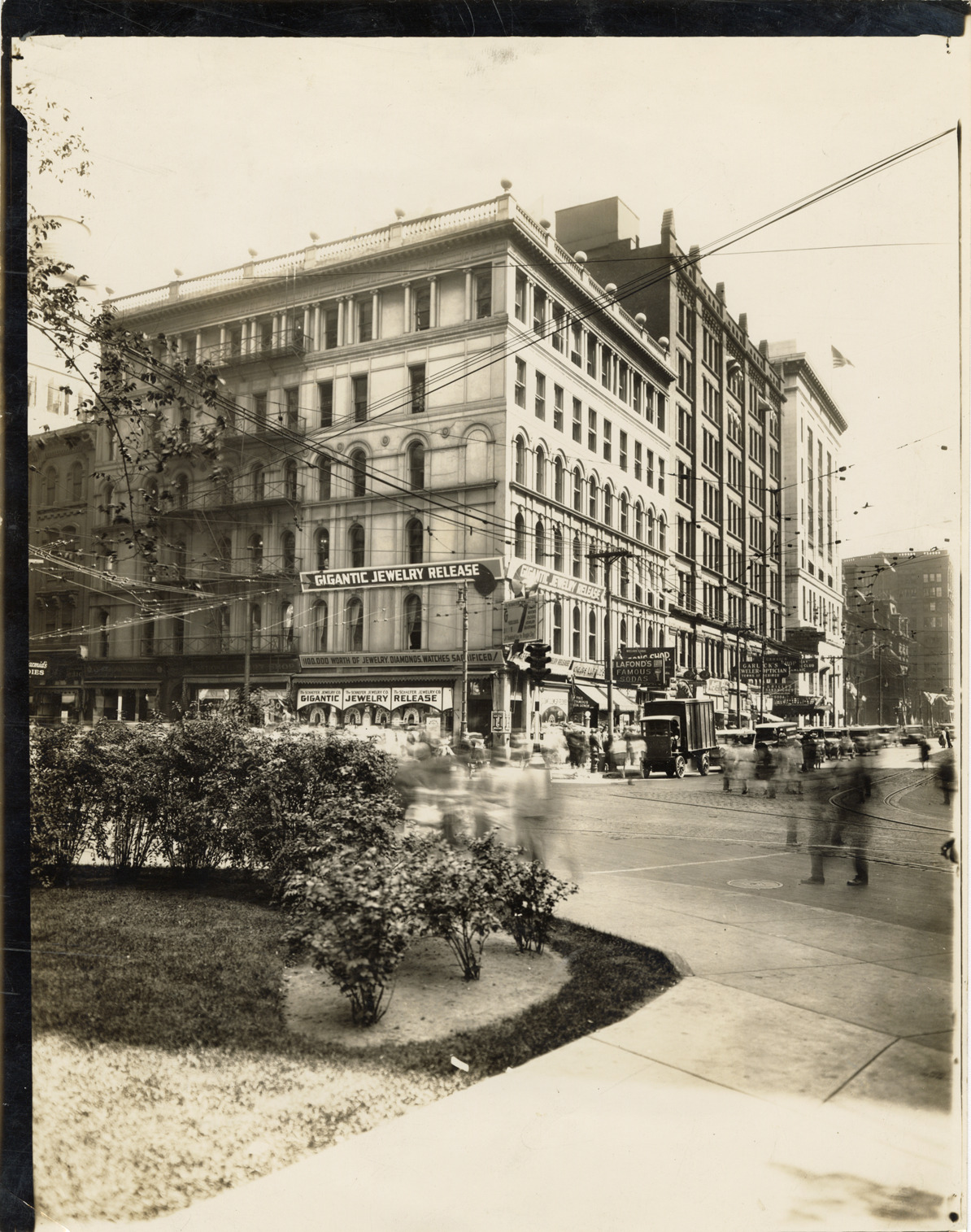 View of the Hodges Building. Sign on building reads: "Gigantic jewelry release." Label on back: "Hodges Building at Griswold & State s/e. During the 1840s Elijah Hawley had a planing mill on this site. The property was purchased by Philetus P. Birch who planned and built the Brunswick House hotel of four stories and sold the property to Henry Clay Hodges & Charles C. Hodges before it was completed. The Brunswick House was a popular hotal [sic] and boarding place for several years. The Hodges brothers closed the hotel about 1889, added two stories to the building and occupied it with their insurance offices, leasing the remainder to other tenants. The Board of Education had its offices on the second floor in the early 1890s. Hugh Connelly's jewelry store was on the corner. Whitney's Opera House, now the Garrick Theater adjoined and across the alley, standing on the corner of Michigan Avenue the Home Savings Bank and afterward the Wayne County & Home Savings Bank has built and occupies two successive buildings. C.M. Burton's Abstract office occupied the upper floors for several years. The Stott Realty Co's to build a tower building on this site."