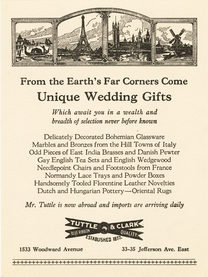 Advertising card for Tuttle & Clark, depicting European landmarks. Printed on front [in part]: "From the earth's far corners come unique wedding gifts which await you in a wealth and breadth of selection never before known. Tuttle & Clark. Blue ribbon quality. Established 1877. 1533 Woodward Avenue. 33-35 Jefferson Ave. East."