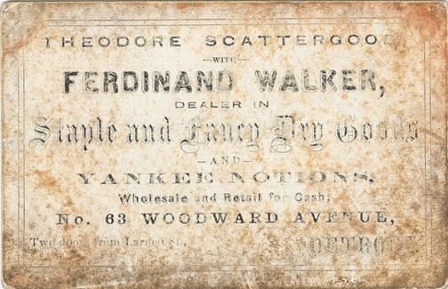 View of a business card for Theodore Scattergood and Ferdinand Walker. Printed on front: "Theodore Scattergood with Ferdinand Walker. Dealer in staple & fancy dry goods, and Yankee notions, wholesale and retail for cash. No. 63 Woodward Avenue. Two doors from Larned Street, Detroit."