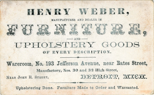 View of a business card for Henry Weber. Printed on front: "Henry Weber, manufacturer and dealer in furniture and upholstery goods of every description. Wareroom, no. 193 Jefferson Avenue, near Bates Street. Manufactory, nos. 30 & 32 High Street, near John R Street, Detroit, Mich. Upholstering done. Furniture made to order, and warranted."