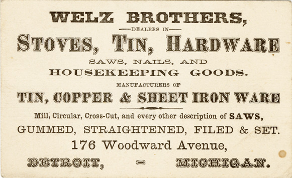 View of a business card for Welz Brothers. Printed on front: "Welz Brothers, dealers in stoves, tin, hardware. Saws, nails and housekeeping goods. Manufacturers of tin, copper & sheet iron ware. Mill, circular, cross-cut, and every other description of saws, gummed, straightened, filed & set. 176 Woodward Avenue, Detroit, Michigan."
