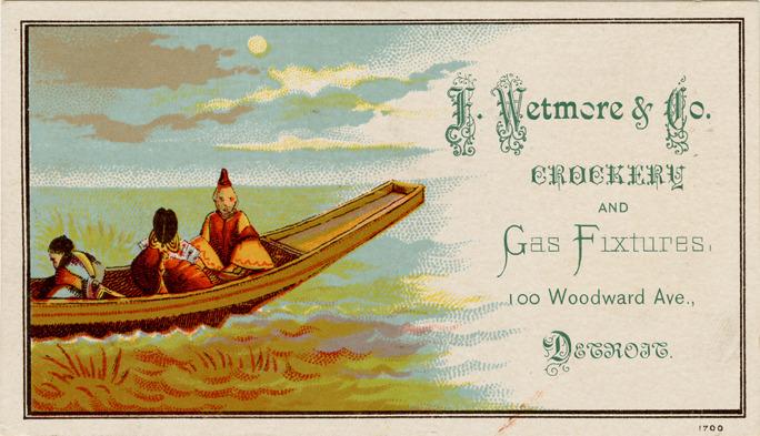 Favorite this☆ Advertising card for F. Wetmore & Co. Description: View of an advertising card for F. Wetmore & Co., depicting three Chinese men in a boat. Printed on front: "F. Wetmore & Co. Crockery and gas fixtures. 100 Woodward Ave., Detroit." Details Resource ID: bh017777 Subject: Pottery industry--Michigan--Detroit Gas-fixtures--Michigan--Detroit Boats and boating in art Chinese in art Advertising cards Date Issued: Unknown year Format: 1 advertising card : col. ; 2.5 x 4.75 in. Member of: Burton Historical Collection Filing Location: E&M 977.4D4 381 W Rights: Physical rights are retained by DPL. Copyright is retained in accordance with U.S. copyright laws.