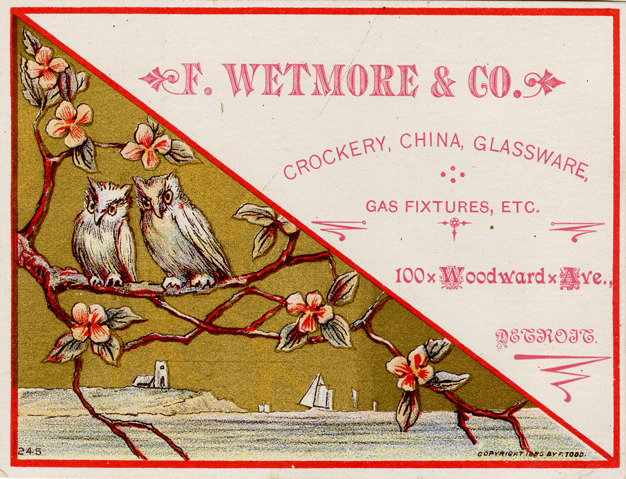 Favorite this☆ Advertising card for F. Wetmore & Co. Description: View of an advertising card for F. Wetmore & Co., depicting two owls on a flowering branch. Printed on front: "F. Wetmore & Co. Crockery, china, glassware, gas fixtures, etc. 100 Woodward Ave., Detroit. Copyright 1880 by F. Todd." Details Resource ID: bh017781 Subject: Pottery industry--Michigan--Detroit Gas-fixtures--Michigan--Detroit Owls in art Advertising cards Publisher: F. Todd Date Issued: 1880 Format: 1 advertising card : col. ; 3.25 x 4.25 in. Member of: Burton Historical Collection Filing Location: E&M 977.4D4 381 W Rights: Physical rights are retained by DPL. Copyright is retained in accordance with U.S. copyright laws.