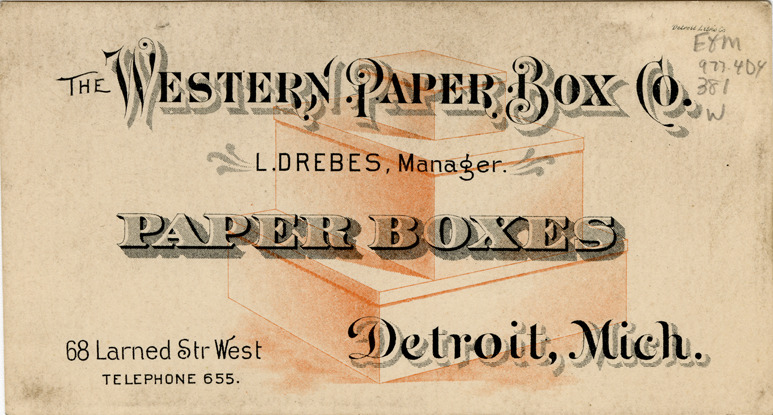 Favorite this☆ Business card for Western Paper Box Co. Description: View of a business card for Western Paper Box Co.. Printed on front: "The Western Paper Box Co. L. Drebes, manager. Paper boxes. 68 Larned Str. West. Detroit, Mich. Telephone 655. Detroit Litho. Co." Details Resource ID: bh017784 Creator: Detroit Lithographic Co. Subject: Paper box industry--Michigan--Detroit Business cards Date Issued: Unknown year Format: 1 business card ; 3 x 5.25 in. Member of: Burton Historical Collection Filing Location: E&M 977.4D4 381 W Rights: Physical rights are retained by DPL. Copyright is retained in accordance with U.S. copyright laws.